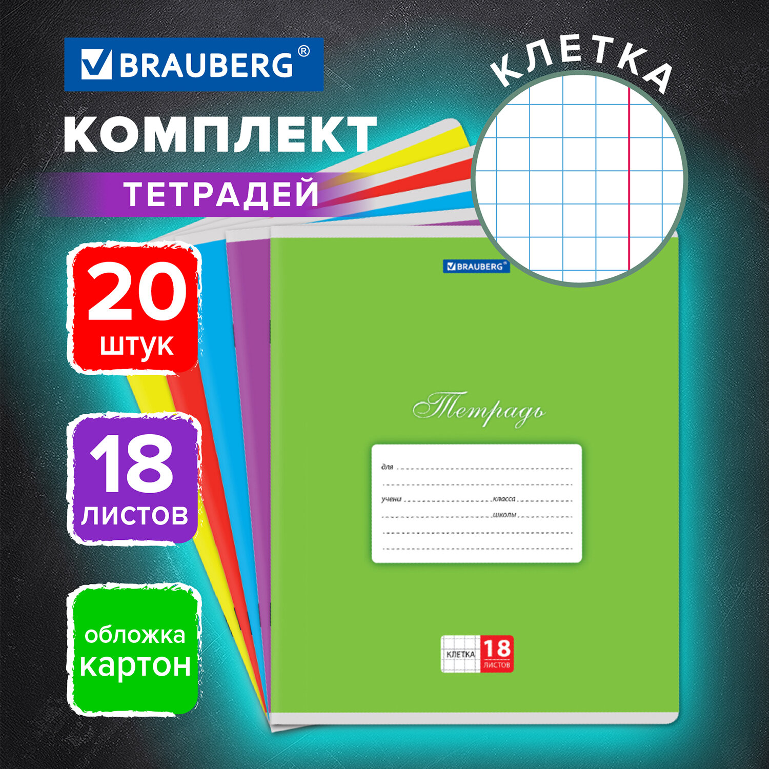 Тетради ДЭК 18 л. КОМПЛЕКТ 20 шт. BRAUBERG КЛАССИКА, клетка, обложка картон, АССОРТИ (5 видов), 106728