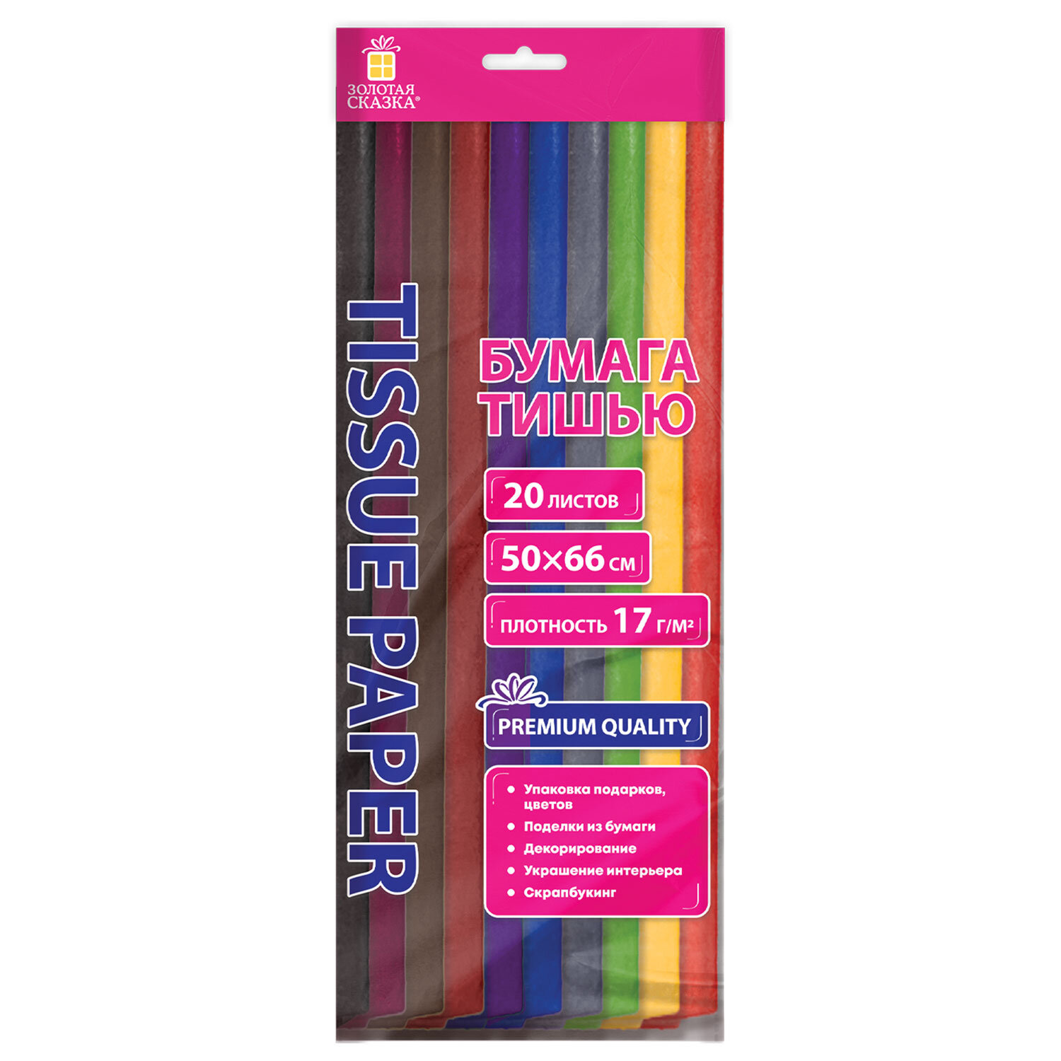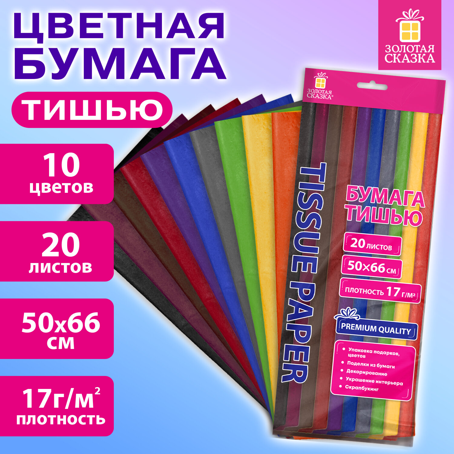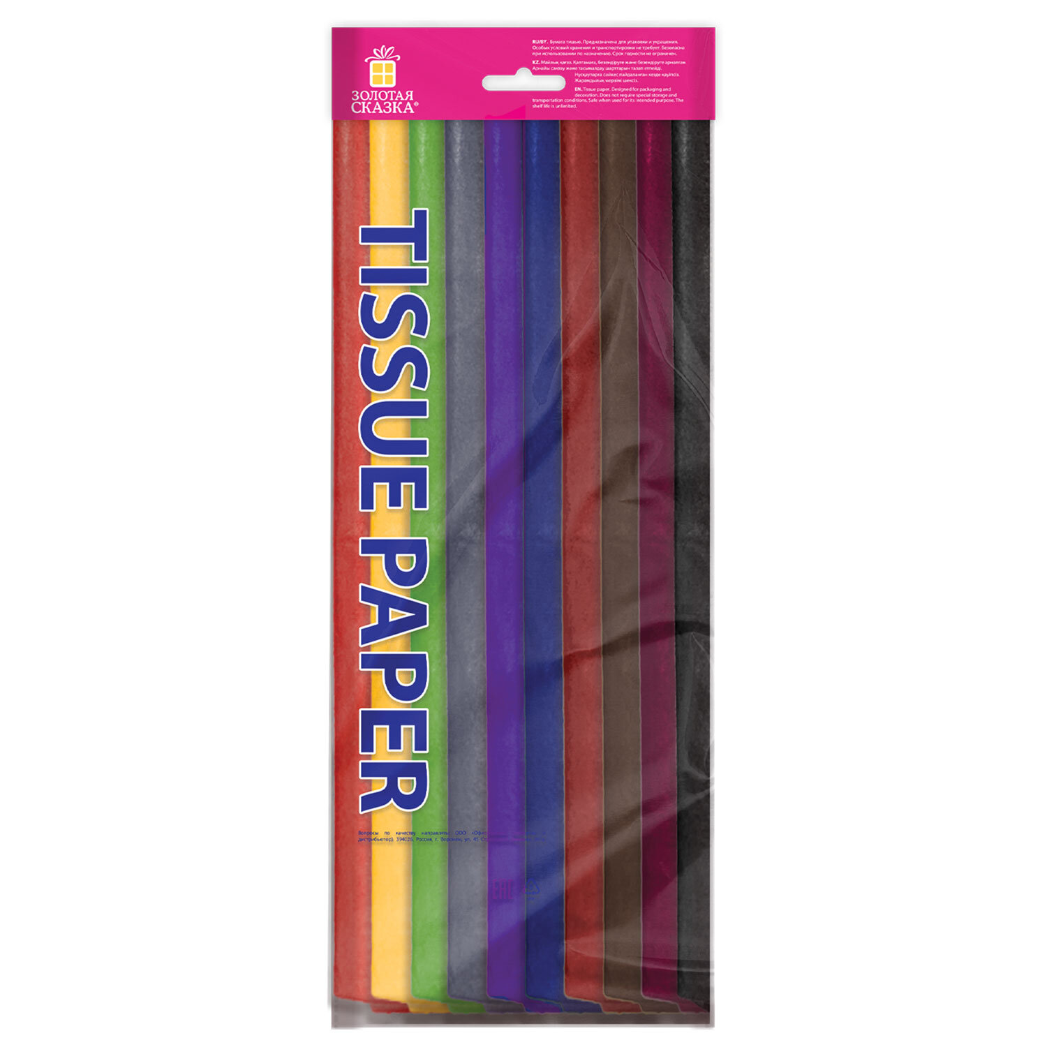 Цветная бумага ТИШЬЮ 17 г/м2, 50×66 см, 20 листов, 10 цветов, интенсив ассорти, ЗОЛОТАЯ СКАЗКА, 116494