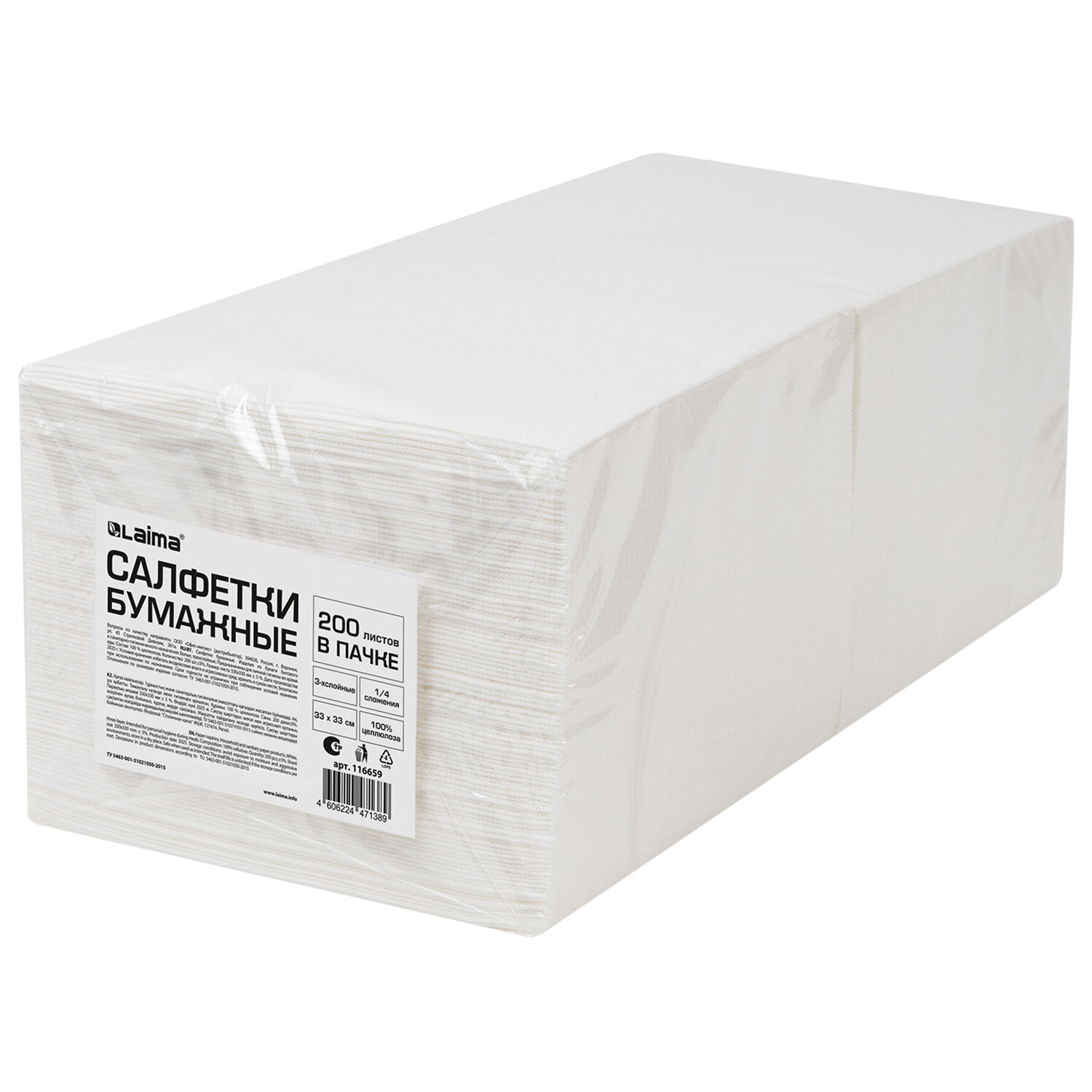 Упаковка содержит 200 салфеток размером 33х33 см. Трехслойные салфетки 1/4 сложения выполнены в классическом белом цвете. Тиснение придает изделию привлекательный внешний вид. Изготовлены из 100% целлюлозы, что обеспечивает прочность и повышенную впитываемость.
