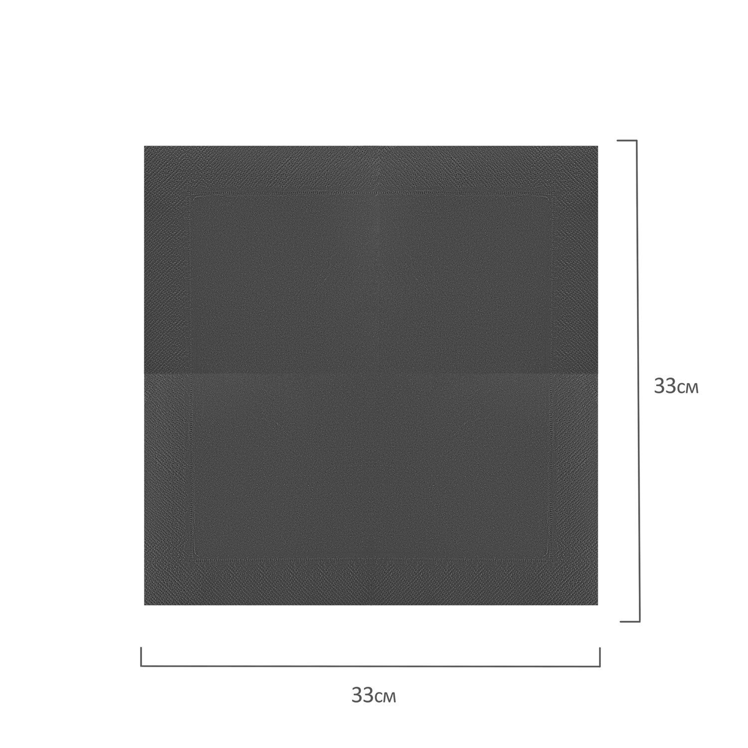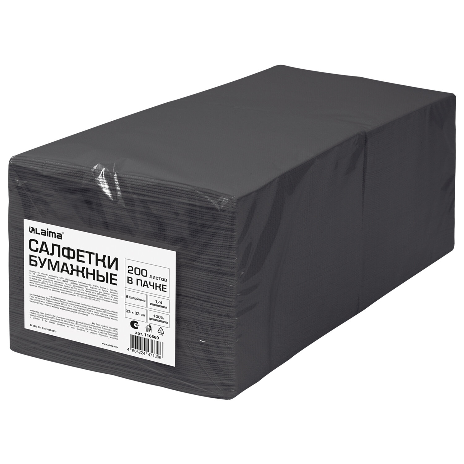 Упаковка содержит 200 салфеток размером 33х33 см. Двухслойные салфетки 1/4 сложения выполнены в классическом черном цвете. Тиснение придает изделию привлекательный внешний вид. Изготовлены из 100% целлюлозы, что обеспечивает прочность и повышенную впитываемость.
