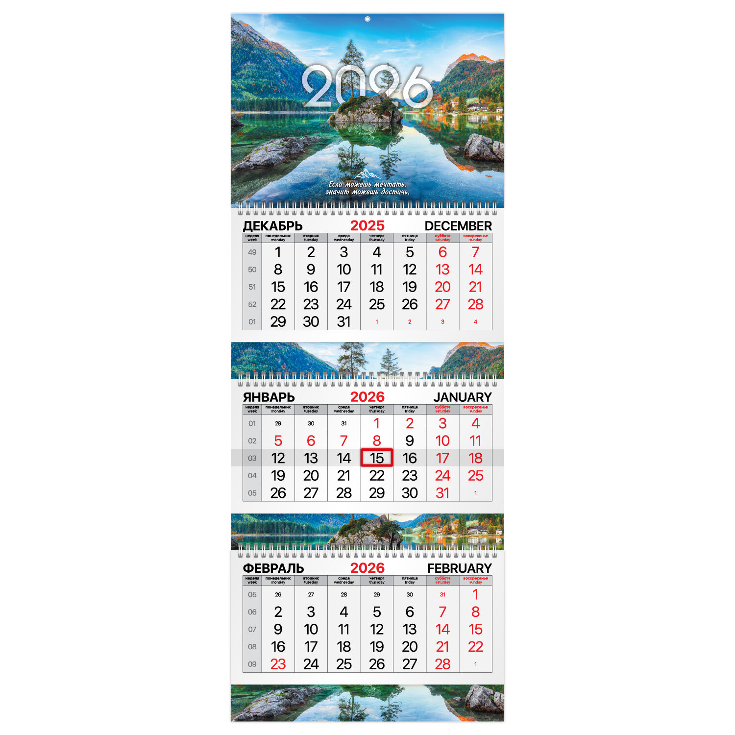 Календарь квартальный 2026 г., 3 блока, 3 гребня, бегунок, мелованная бумага, BRAUBERG EXTRA, «Горное озеро», 116822