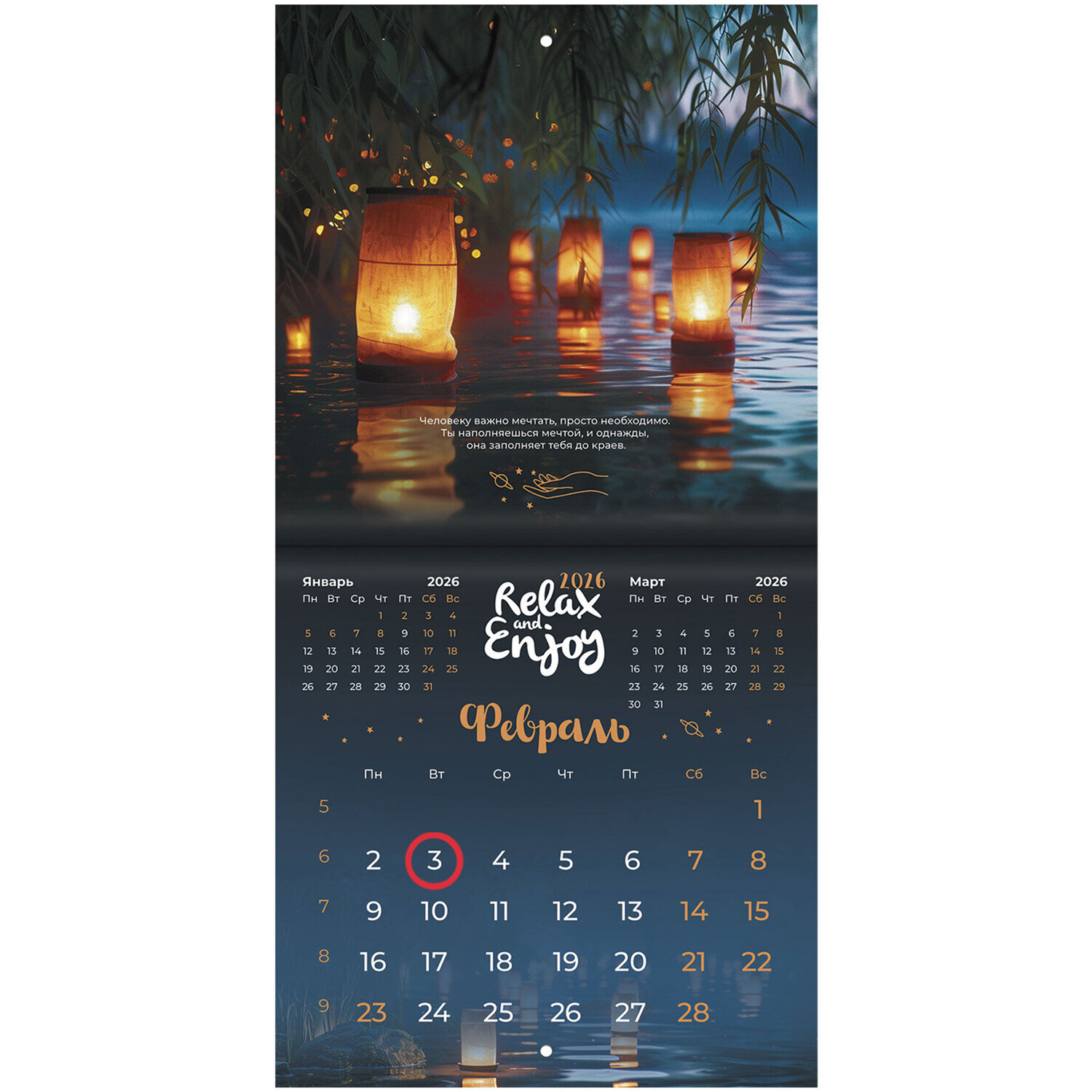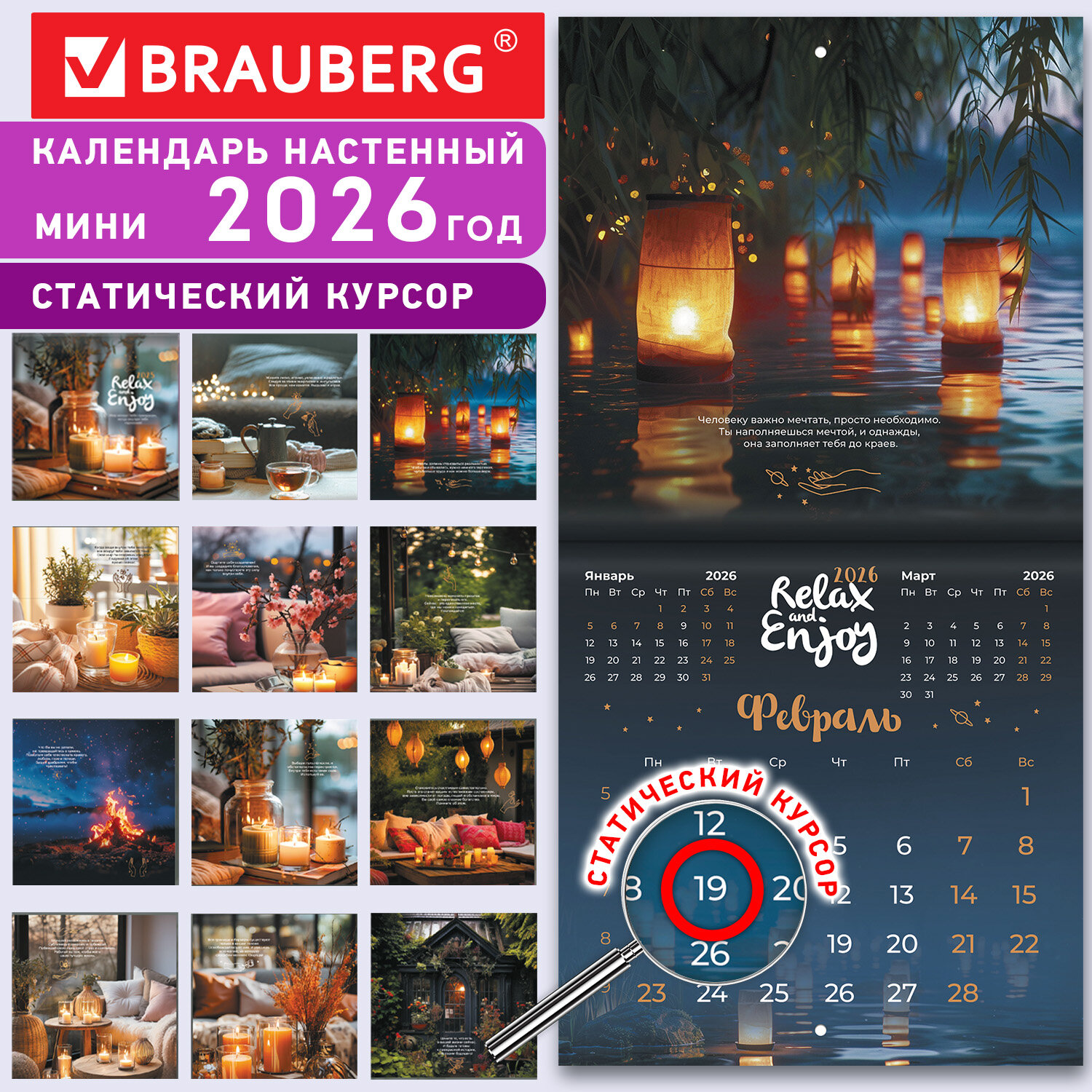 Календарь настенный перекидной 2026 г., BRAUBERG, 12 листов, 21,4×21,4 см, МИНИ, «Relax», 116941