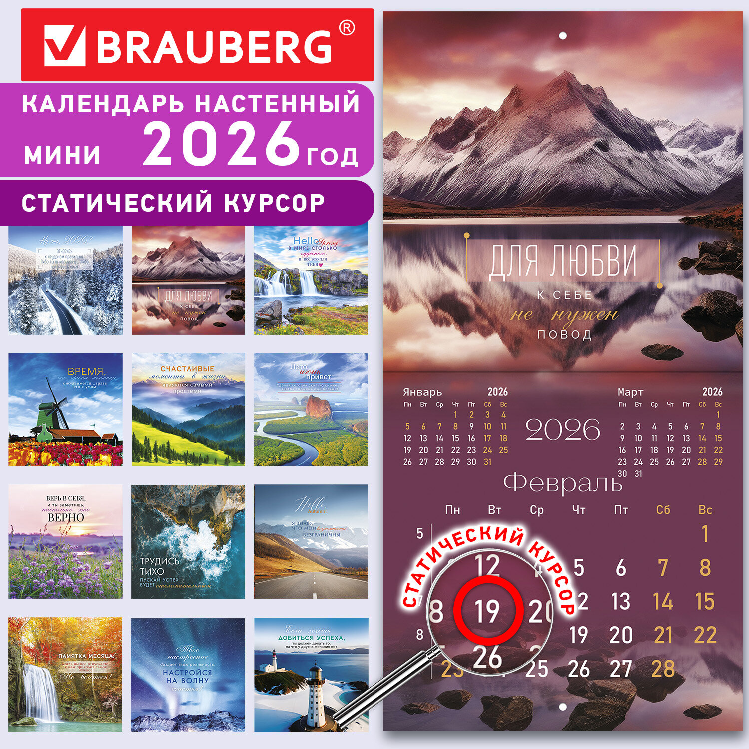Календарь настенный перекидной 2026 г., BRAUBERG, 12 листов, 21,4×21,4 см, МИНИ, «Мотивация», 116945