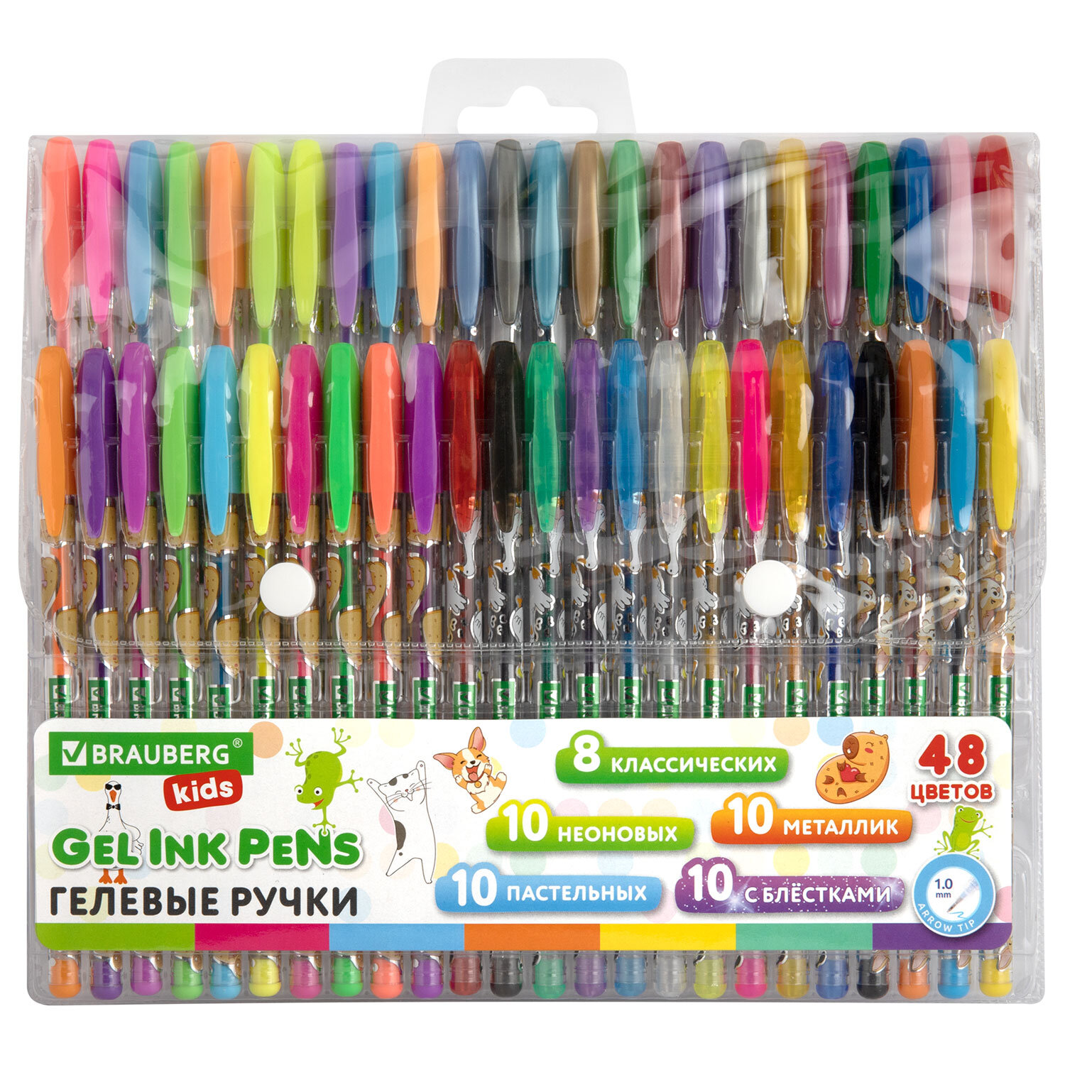 Ручки гелевые BRAUBERG KIDS «CUTE ANIMALS», НАБОР 48 ЦВЕТОВ, корпус с печатью, узел 1 мм, линия письма 0,7 мм, 144449