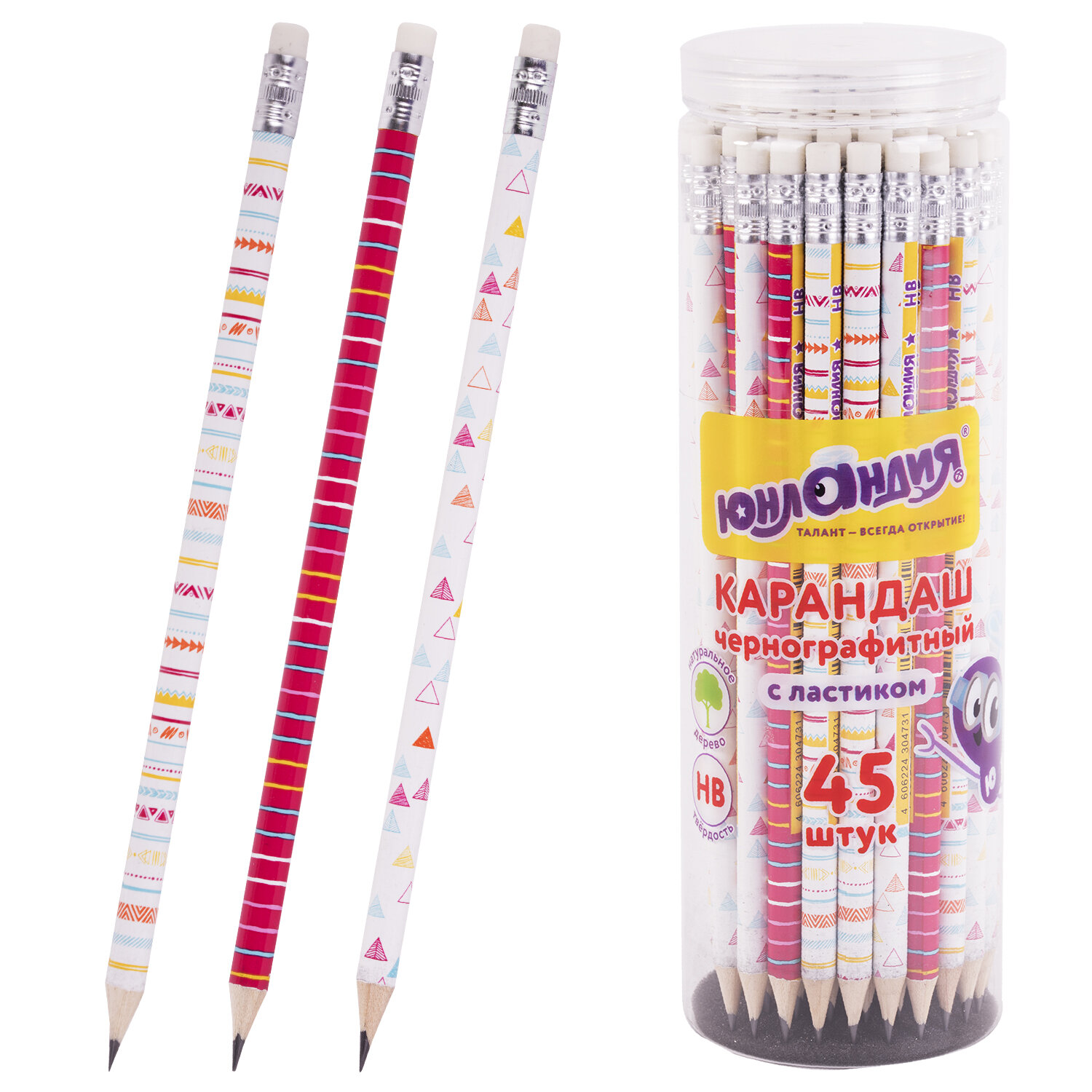 Карандаш чернографитный ЮНЛАНДИЯ «ГЕОМЕТРИЯ», 1 шт., HB, с ластиком, корпус ассорти, 181775