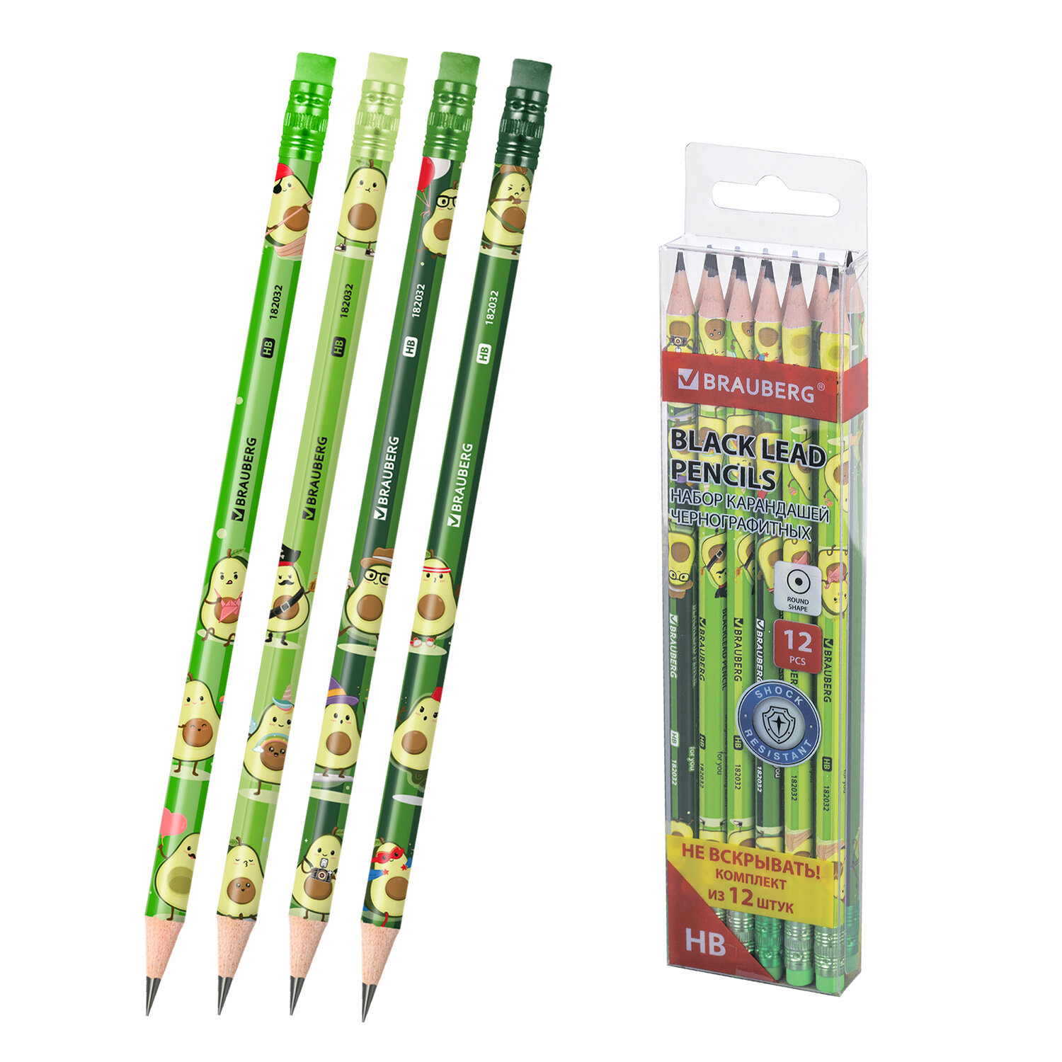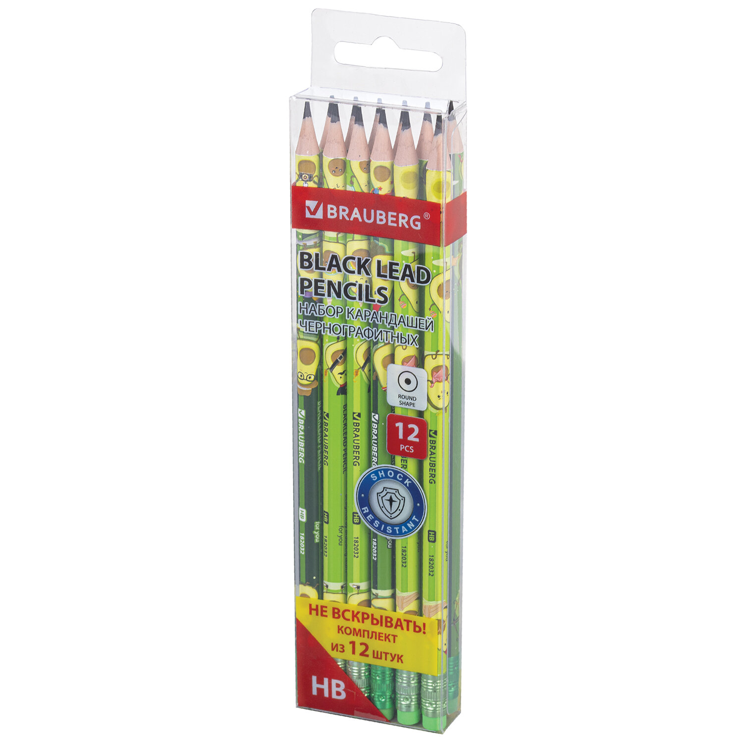 Набор карандашей чернографитных с принтом BRAUBERG «AVOCADO», 12 штук, HB, с ластиком, корпус ассорти, 182032