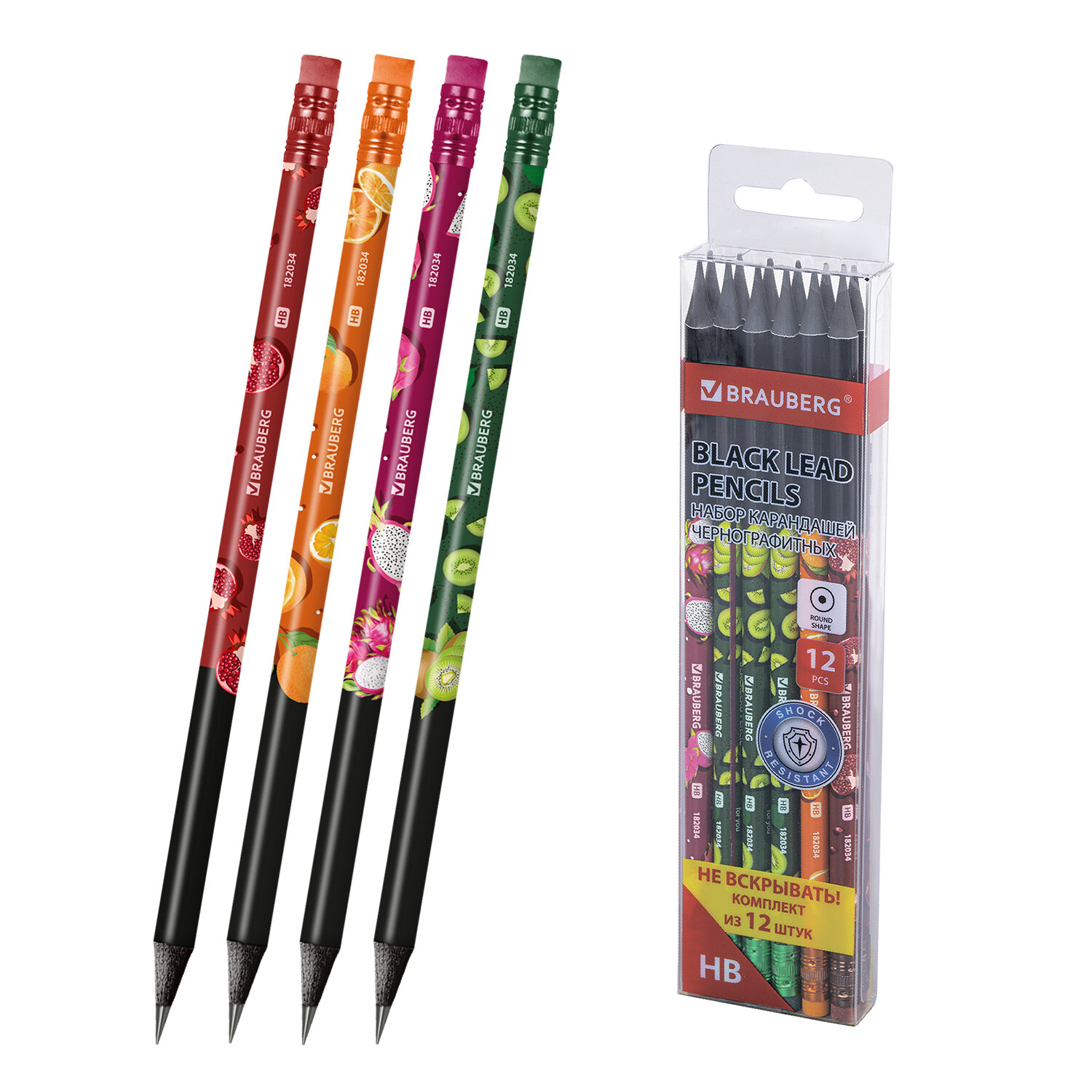 Набор карандашей чернографитных с принтом BRAUBERG «JUICY FRUIT», 12 штук, HB, с ластиком, корпус ассорти, 182034