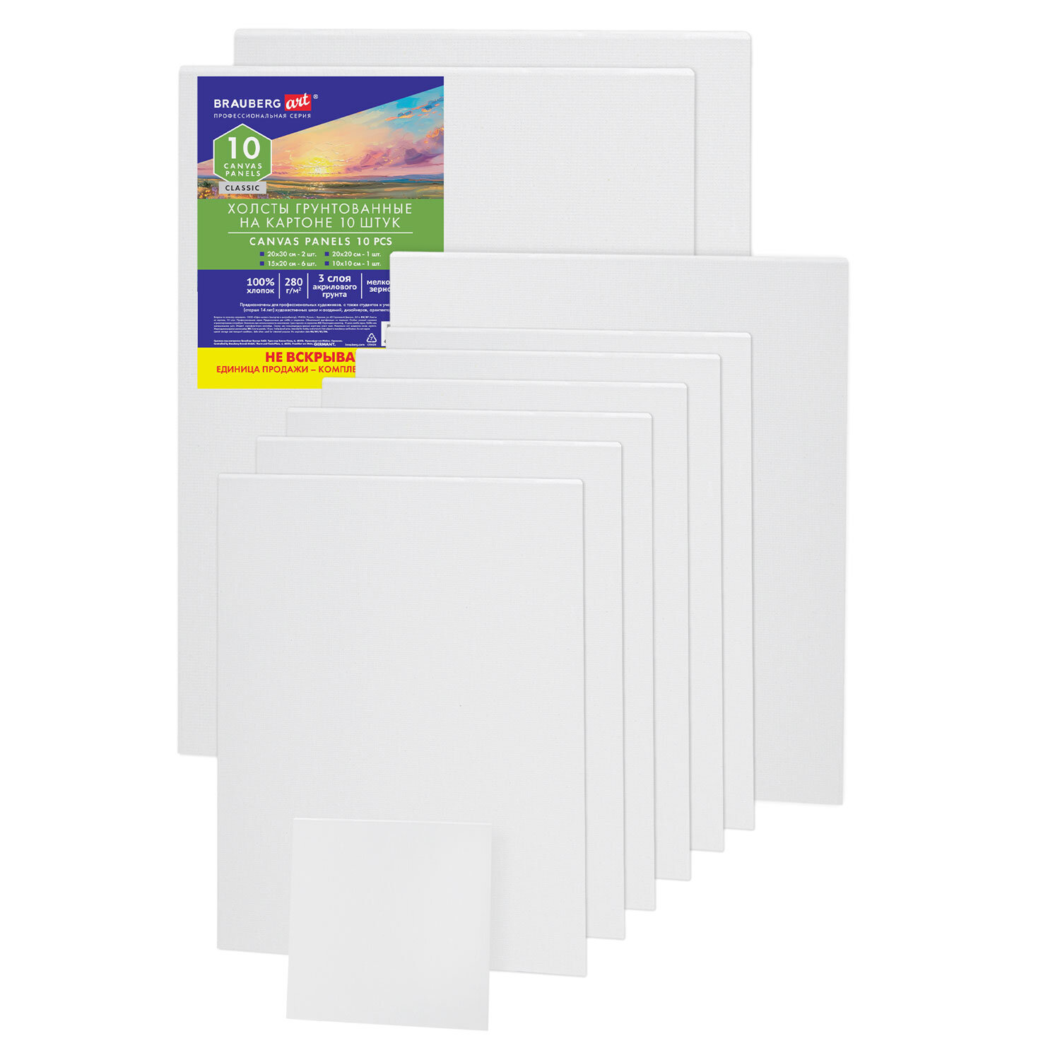 Прочная поверхность холста выдерживает множество слоев краски и воздействие разбавителей, хорошо переносит изменения влажности и температуры. Грунтованное мелкозернистое полотно из хлопка плотностью 280 г/м2 наклеено на основу из плотного картона. Холст на картоне легче и меньше по сравнению с холстами на подрамнике, тем самым он очень удобен для транспортировки. Набор из 10 холстов.