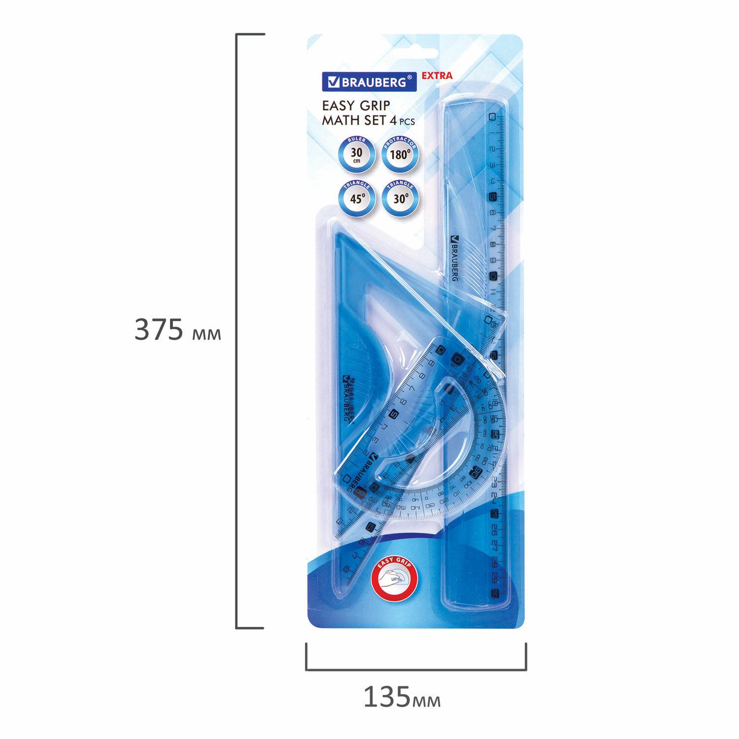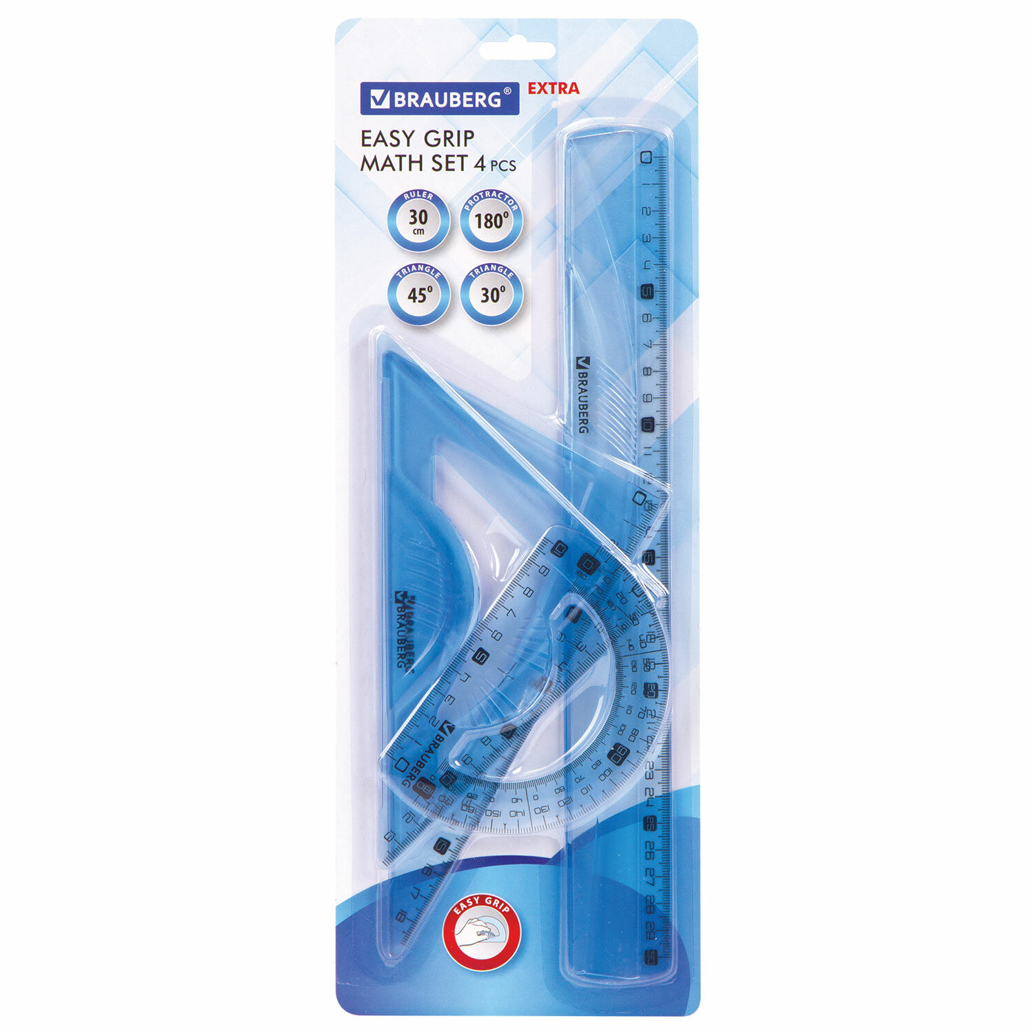 Набор чертежный BRAUBERG «EXTRA» (линейка 30 см, 2 угольника, транспортир), тонированный голубой, 210747