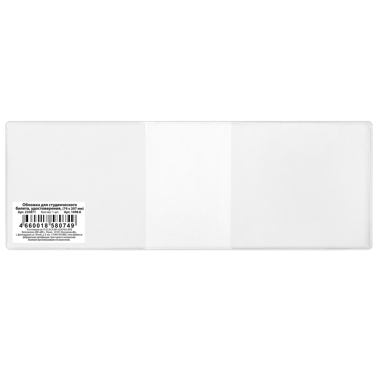 Обложка для студенческого билета, удостоверения, 104×74 мм, ПВХ, прозрачная, ДПС, 1098.К