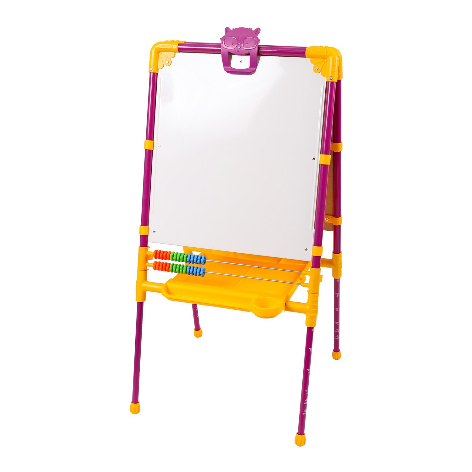 По цвету и дизайну мольберт подходит для мальчиков и девочек. Регулировка по росту в диапазоне от 75,5 до 107,5 сантиметра позволяет использовать приспособление несколько лет по мере роста и взросления ребенка. Размер рабочей поверхности: 53х46 см.