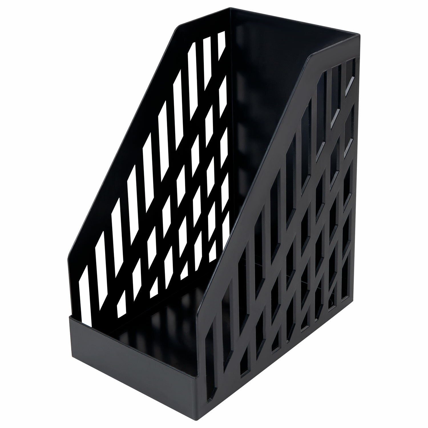 Выполнен в черном цвете, с одним отделением. Предназначен для хранения документов формата А4. Представляет собой устойчивую неразборную конструкцию из гладкого пластика с отверстиями по бокам. Размеры: высота - 290 мм, ширина - 160 мм, глубина - 250 мм.