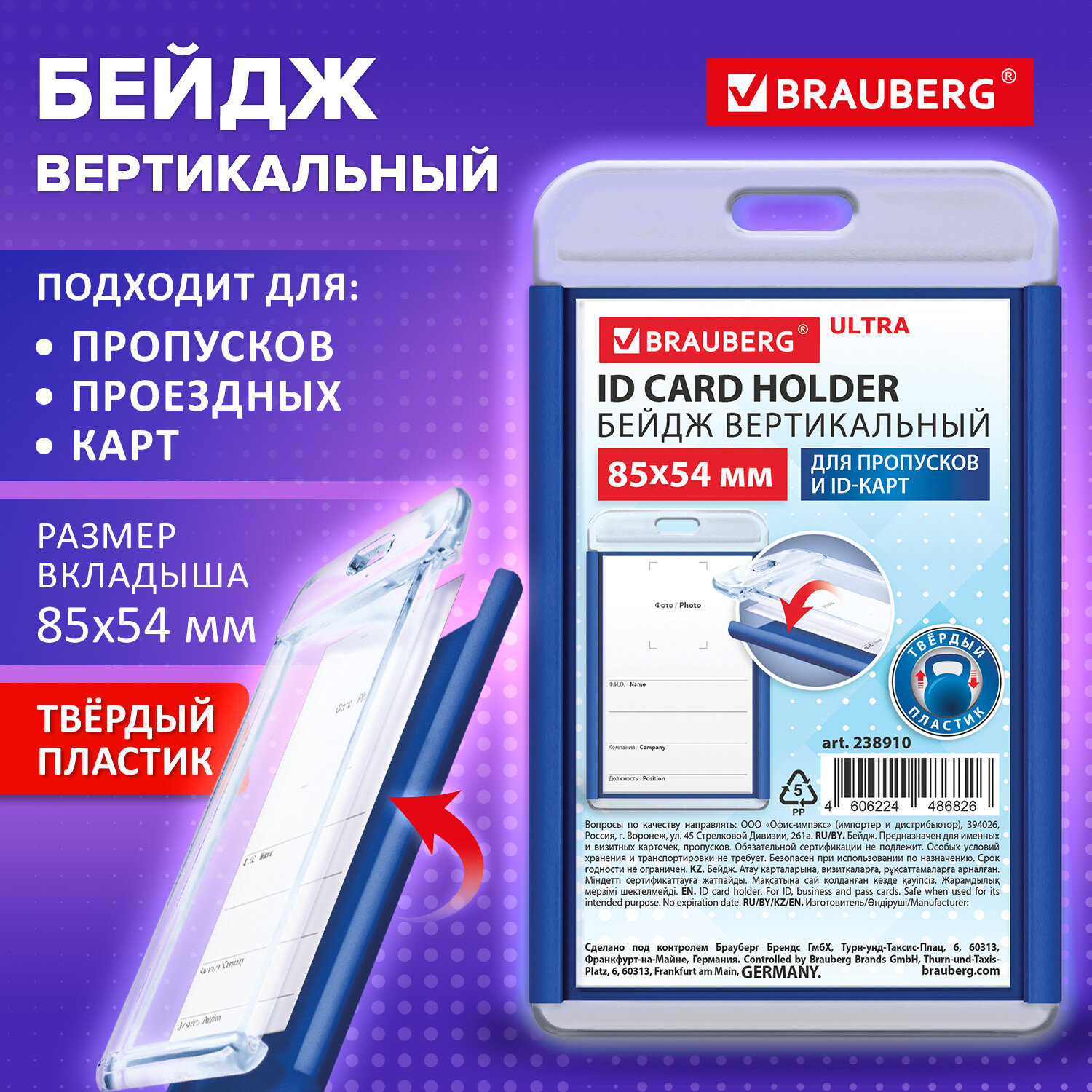 Вертикальный бейдж BRAUBERG ULTRA для хранения пропусков и карточек сотрудников, ID-карт, проездных и банковских карт.