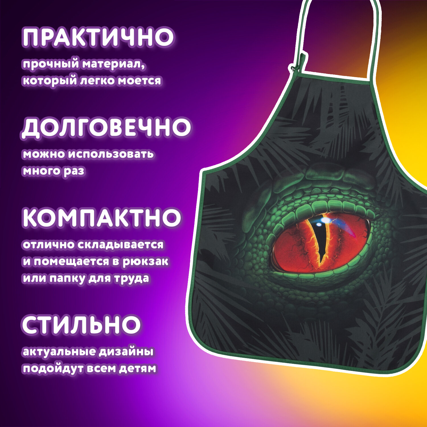 Выполнен из плотного полиэстера с водоотталкивающей пропиткой. Яркая и четкая печать дизайна на фартуке. В комплекте два нарукавника. Размер фартука 45х54 см, подходит для детей ростом от 117 см. Фартук оснащен карабином для регулировки по росту. Размер нарукавников - 23х13 см.
