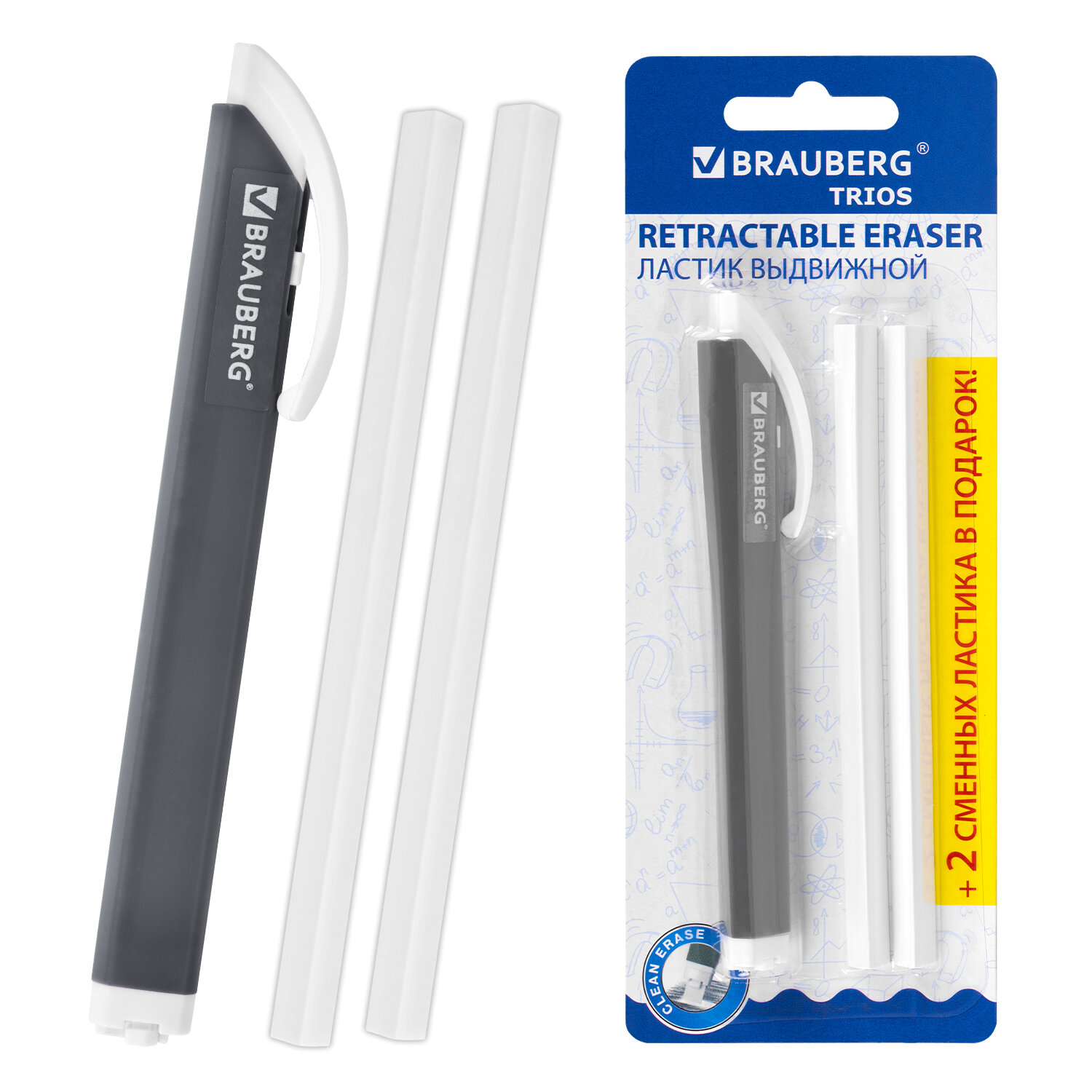 Ластик выдвижной + 2 сменных ластика BRAUBERG «TRIOS», 124×12×12 мм, графитовый корпус, 272692