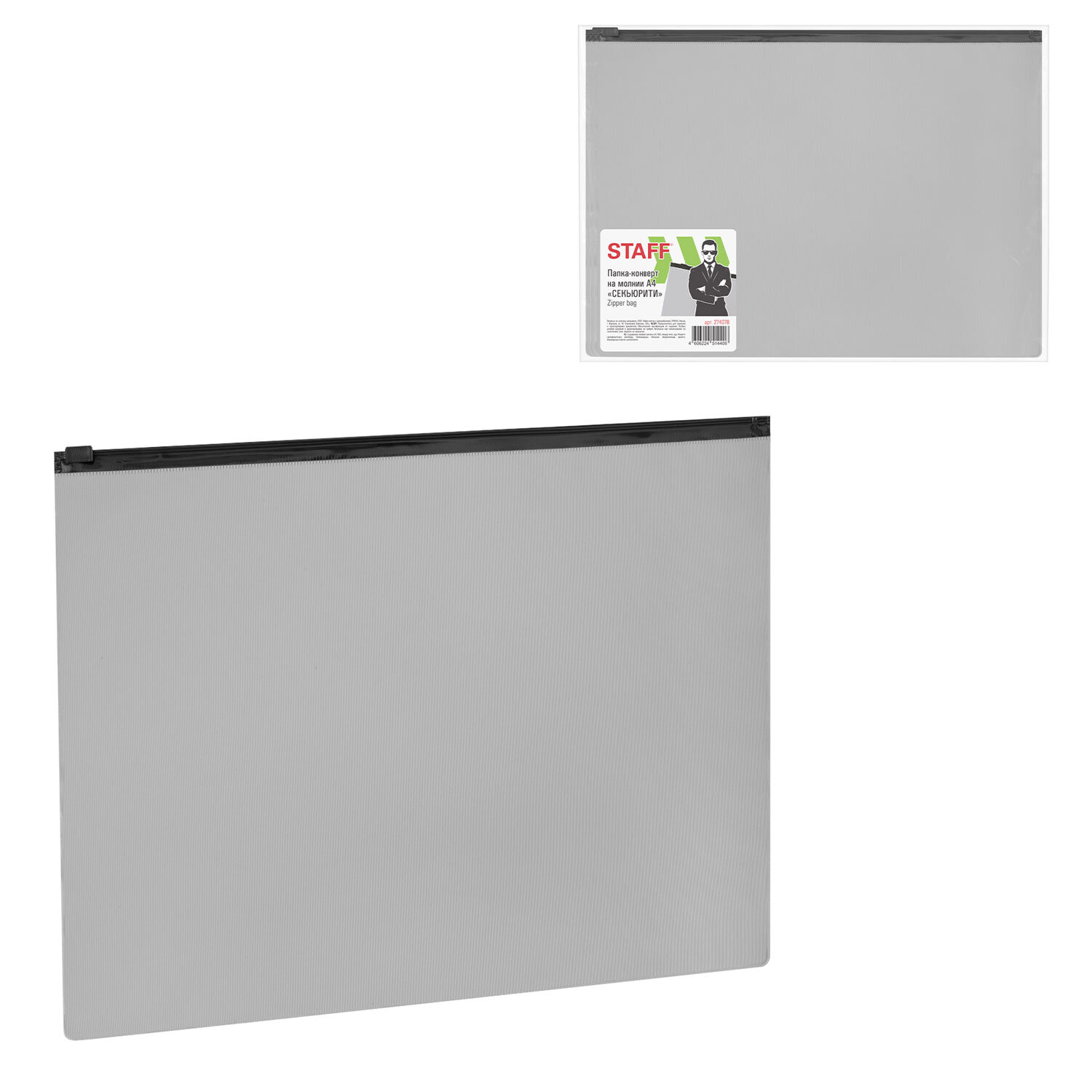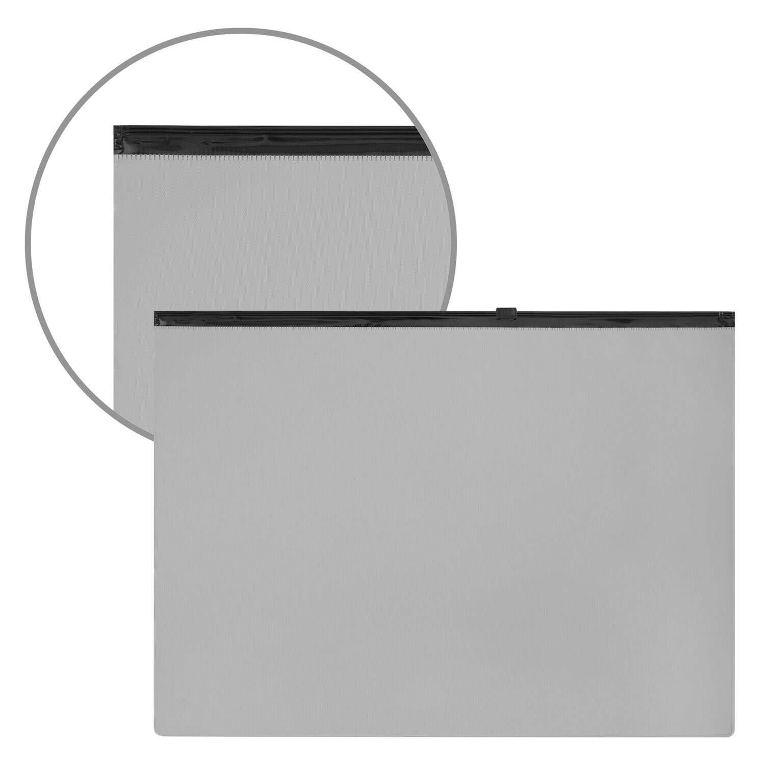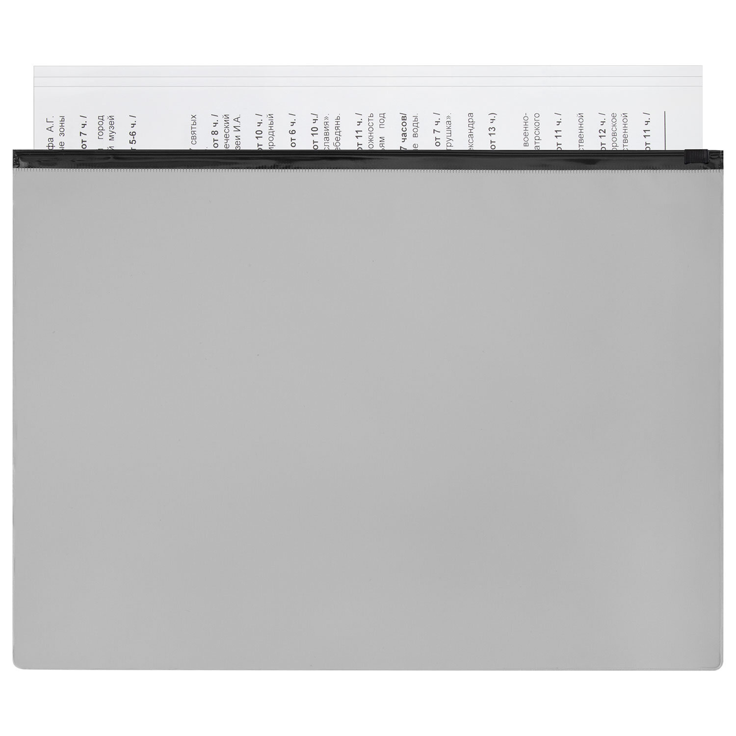 Изготовлена из непрозрачного серого пластика с фактурной поверхностью толщиной 0,23 мм. Формат – А4 (230х333 мм). Герметичная застежка-зиплок защищает документы от механических повреждений, а также от пыли и влаги. Непрозрачный материал обеспечивает надежную защиту содержимого папки от посторонних глаз. Цвет молнии – черный.