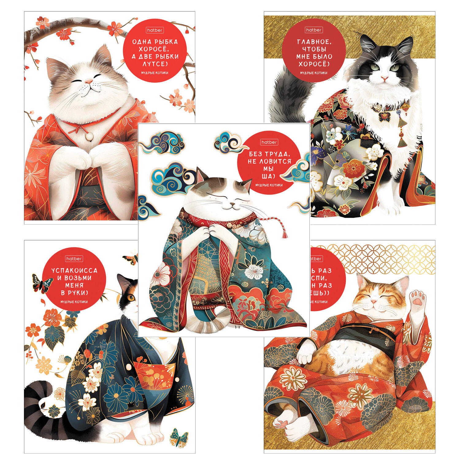Тетрадь А5 48 л., HATBER скоба, клетка, обложка картон, «Мудрые котики» (микс в спайке), 088362