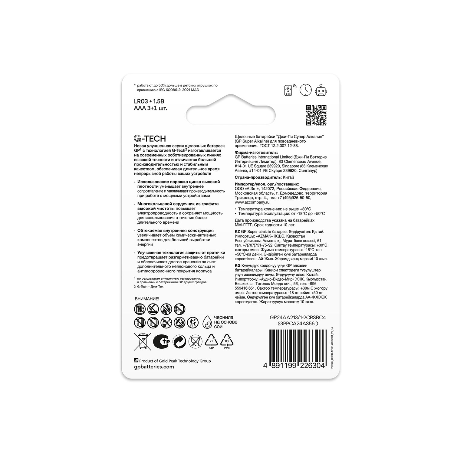 У батареек GP Super Alkaline продолжительность работы в несколько раз выше, чем у солевых. Батарейки подходят для любых устройств повседневного использования, где требуется элемент питания типоразмера ААА.