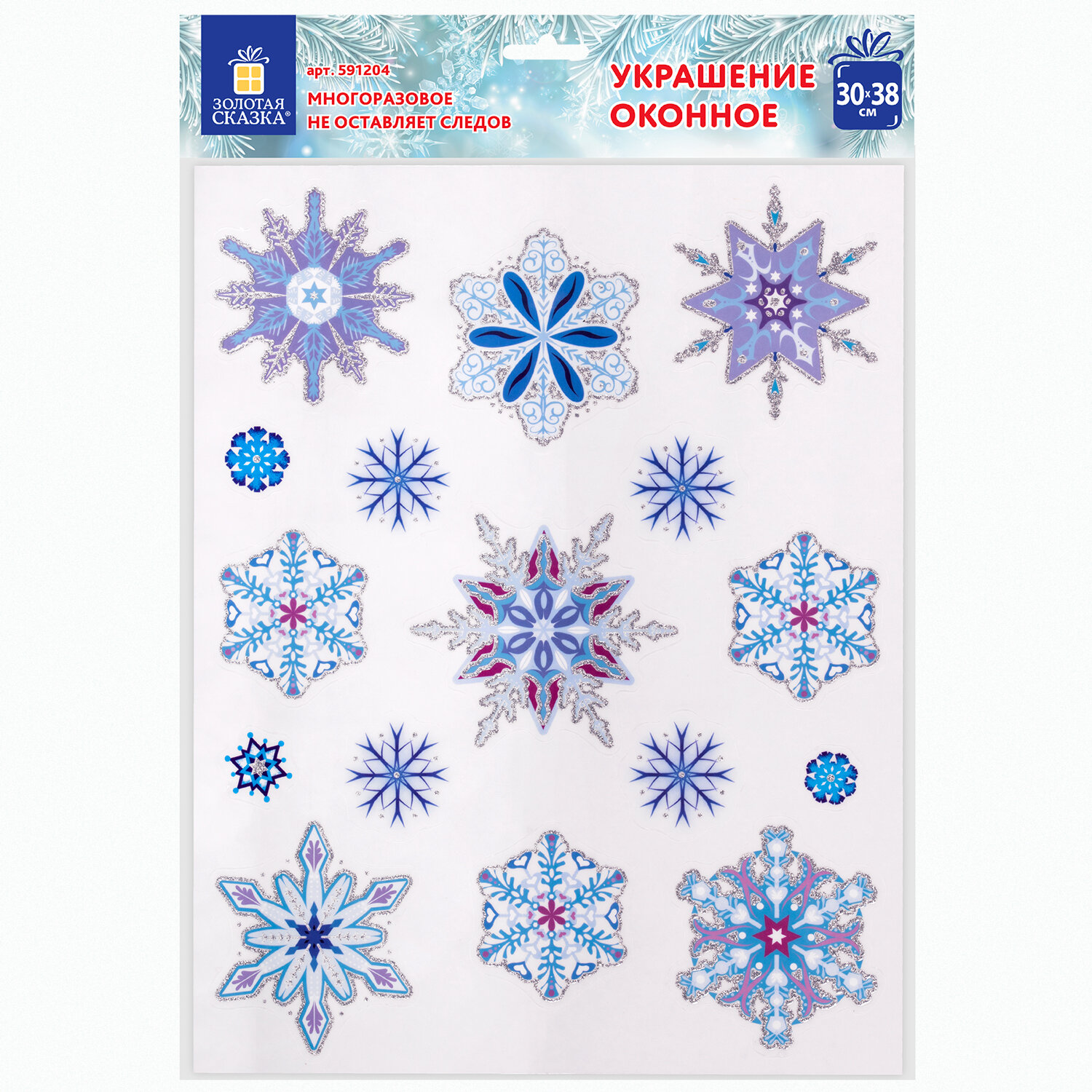Изделие с изображением сине-голубых снежинок представляет собой наклейку, изготовленную из поливинилхлорида (ПВХ). Наклейка размером 30x38 см декорирована серебристым глиттером. Украшение предназначено для декорирования окон, зеркал, стекол и других ламинированных глянцевых поверхностей. Не оставляет клеевых следов и предназначено для многократного использования. Крепится к поверхности посредством статического эффекта. Украшение на белой картонной подложке упаковано в прозрачный полипропиленовый пакет на картонном подвесе.