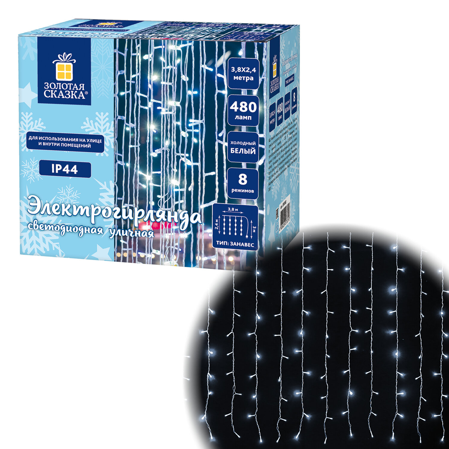 Электрогирлянда-занавес уличная «Штора» 3,8×2,4 м, 480 LED, белый 220 V, контроллер, ЗОЛОТАЯ СКАЗКА, 591302