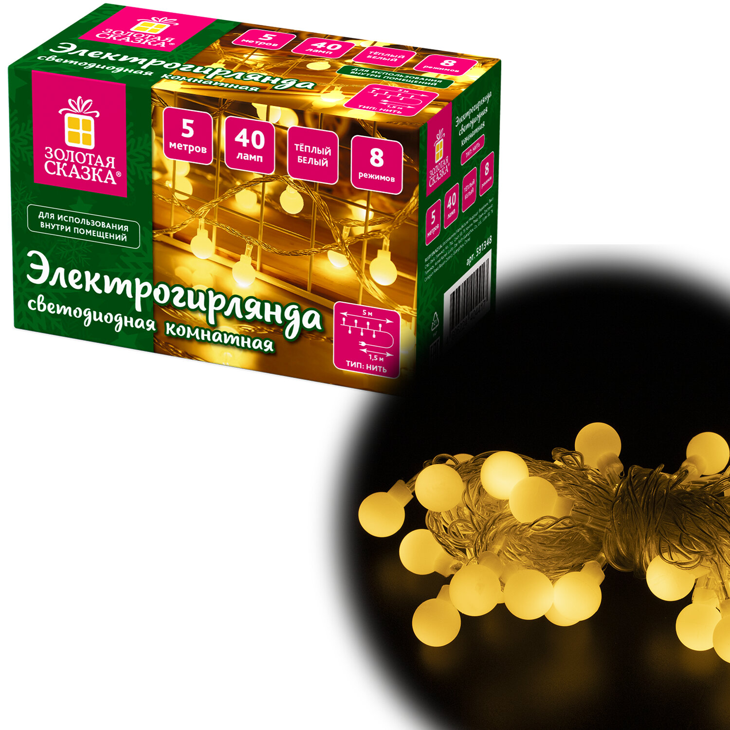 Электрогирлянда-нить комнатная «Шарики» 5 м, 40 LED, теплый белый свет, 220 V, контроллер, ЗОЛОТАЯ СКАЗКА, 591348