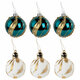 3 шара бирюзового цвета диаметром 6 см с золотистым рисунком с глянцевым эффектом, а также 6 нитей из полиэстера золотистого цвета длиной 30 см для подвешивания шаров.