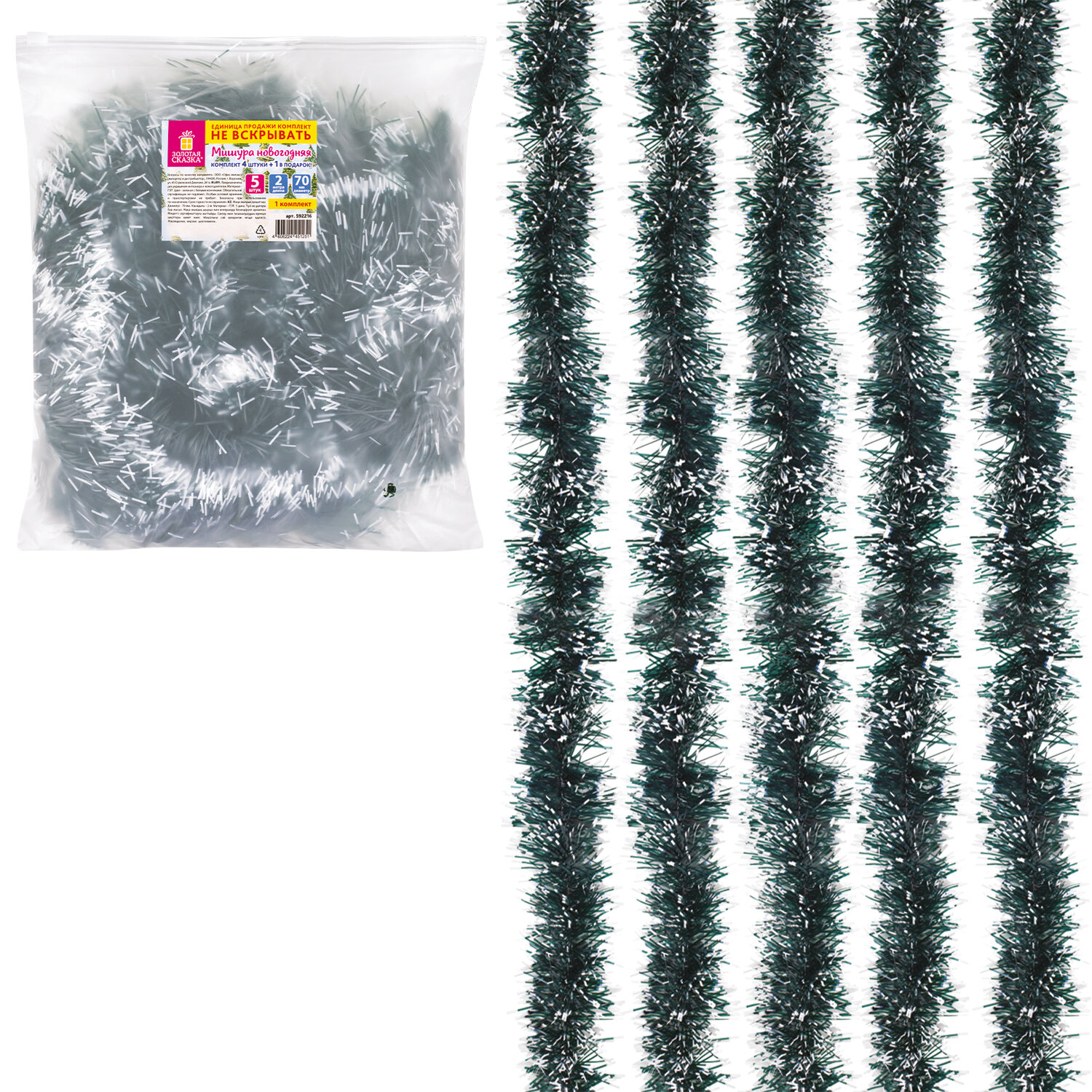 Длина мишуры в расправленном виде составляет 2 м, диаметр – 7 см. Материал мишуры – полиэтилентерефталат. В комплекте – 5 штук зелёной мишуры с белыми кончиками. Упакованы в пакет с зиплоком.