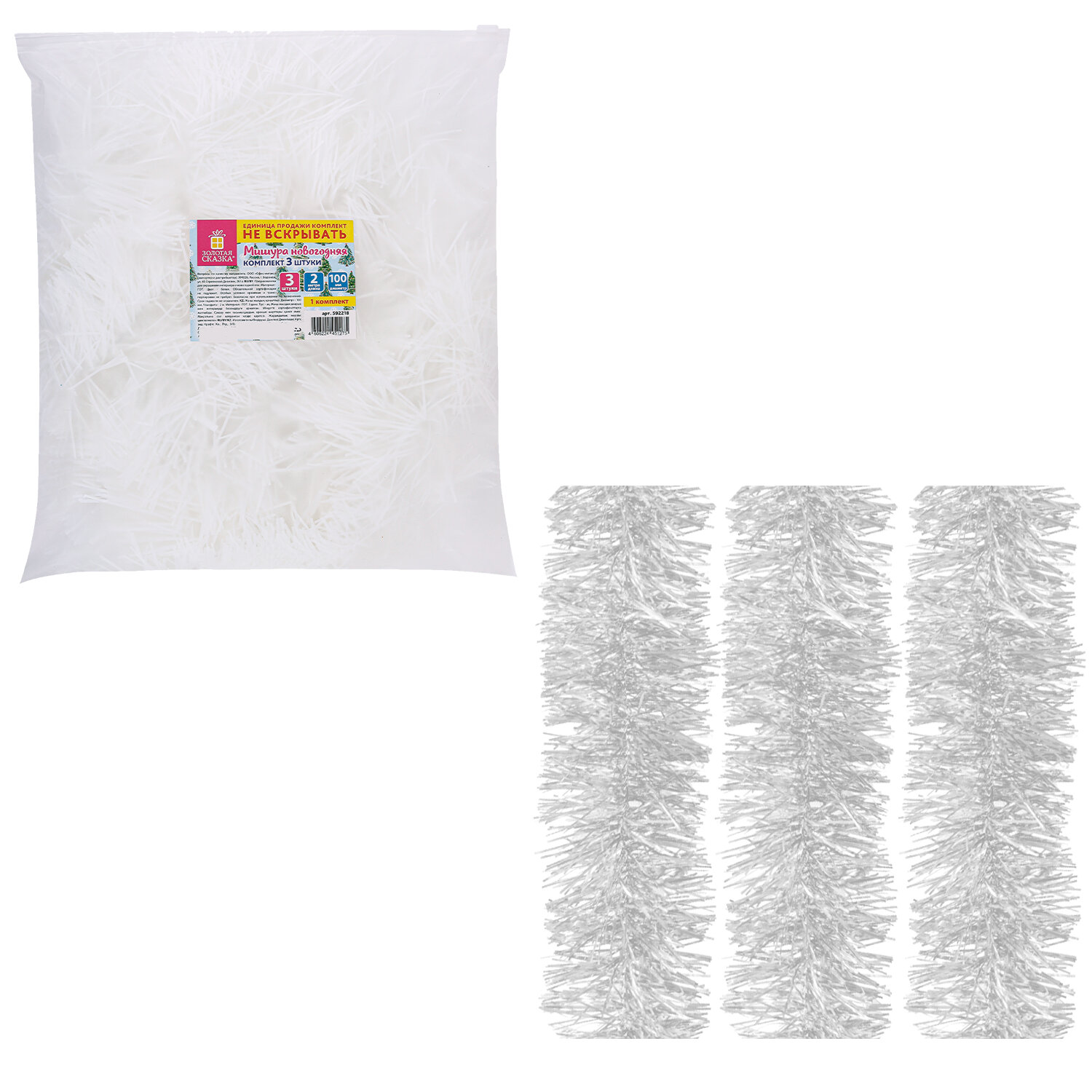 Длина мишуры в расправленном виде составляет 2 м, диаметр – 10 см. Материал мишуры – полиэтилентерефталат. В комплекте – 3 штуки мишуры белого цвета. Упакованы в пакет с зиплоком.