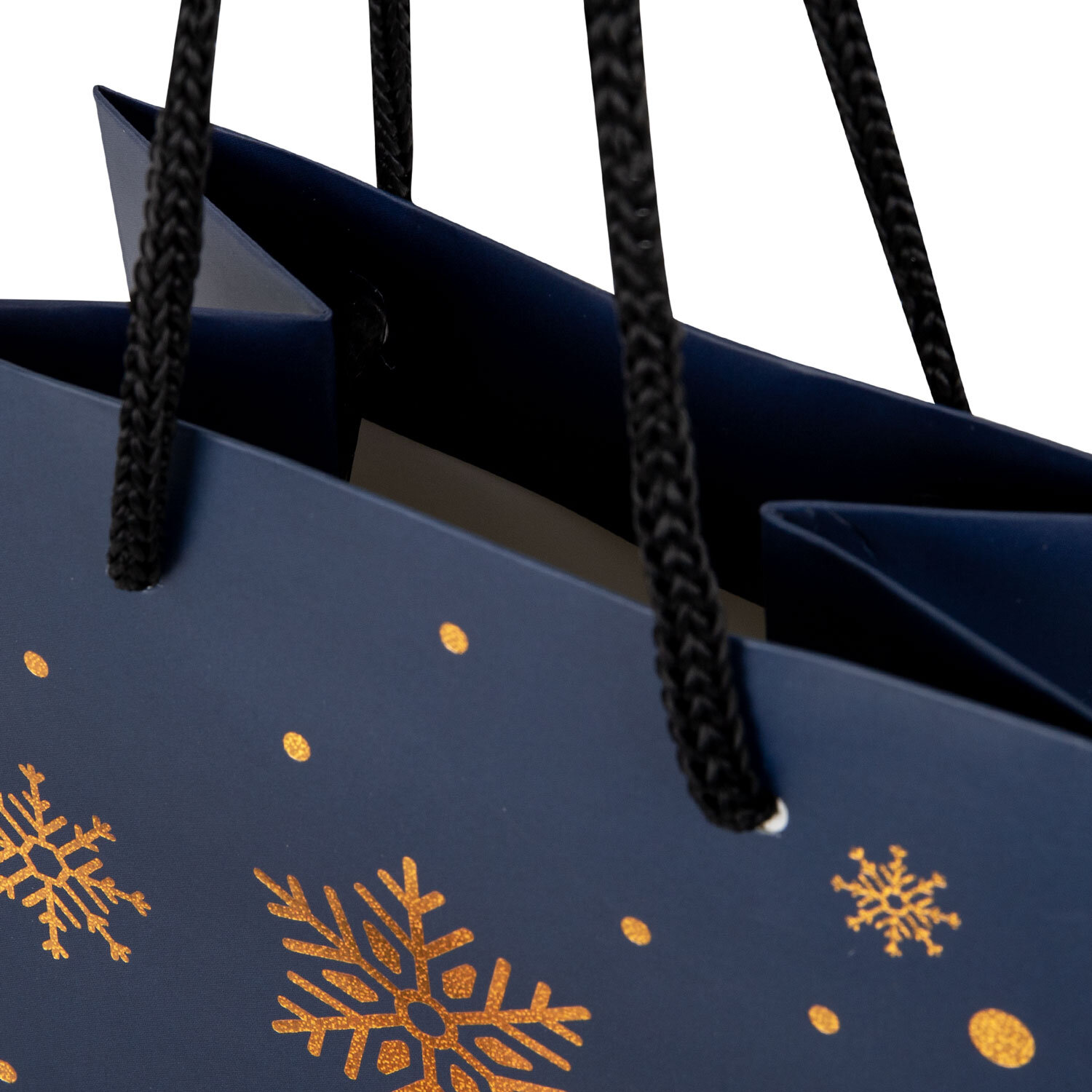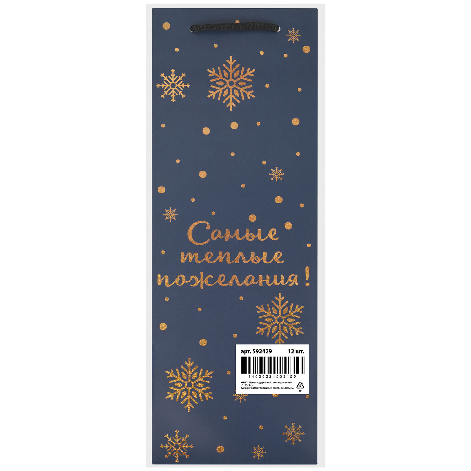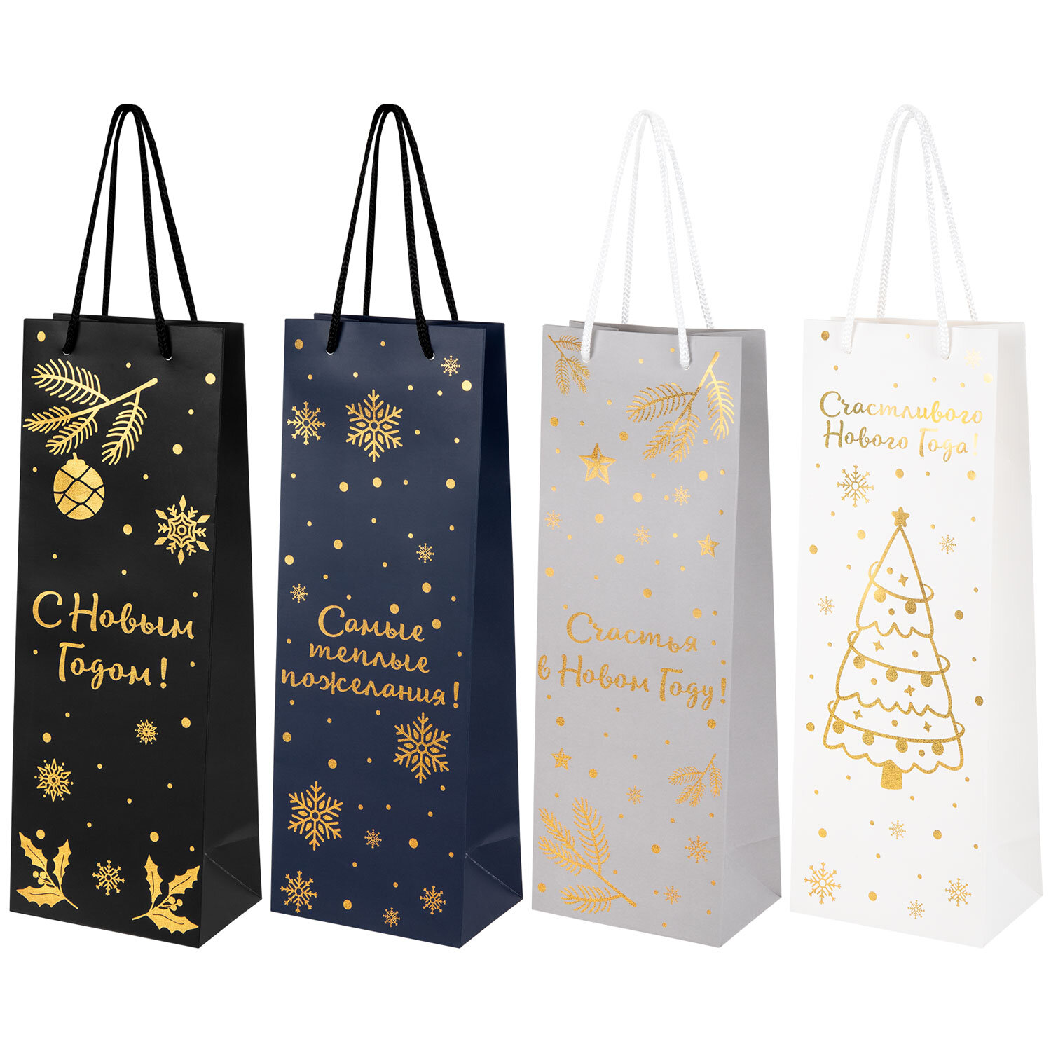 На каждом пакете написаны новогодние пожелания, что делает пакет частью поздравления. Можно просто вручить его с добрыми словами – и он всё скажет за Вас. Дополнительные элементы декора – маленькие снежинки, звёздочки и веточки – создают атмосферу праздника и добавляют каждому пакету особую магию в сочетании с переливающимся голографическим эффектом на всех деталях рисунка. Размер – 13x9x36 см.