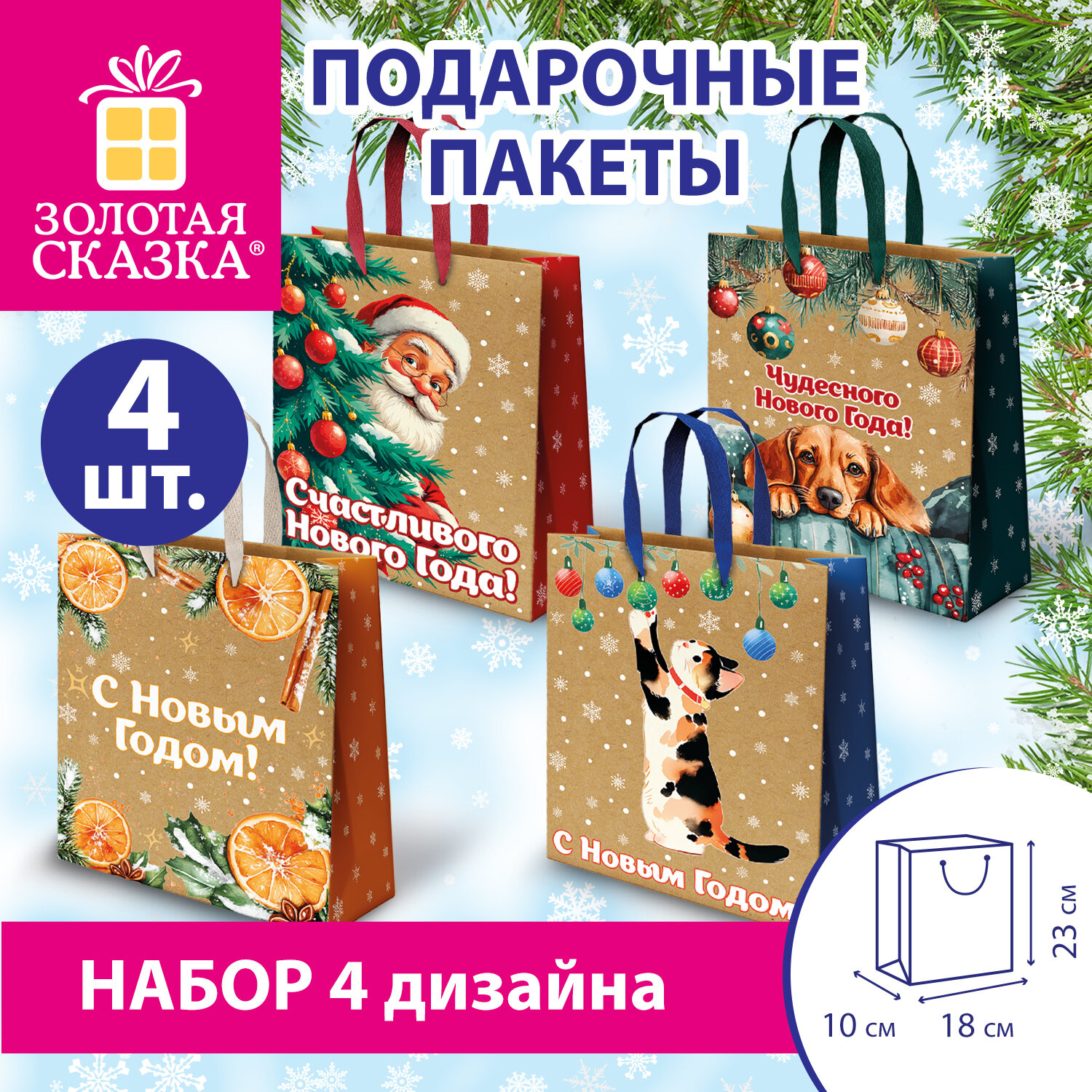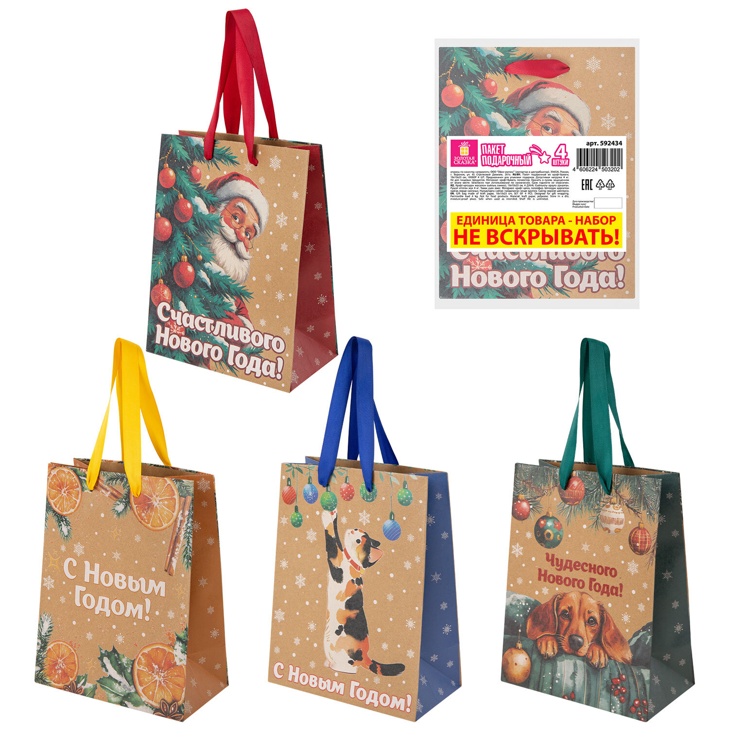 Пакет подарочный НАБОР 4 шт., новогодний, 18×10×23 см, «Зимнее волшебство», крафт, ЗОЛОТАЯ СКАЗКА, 592434