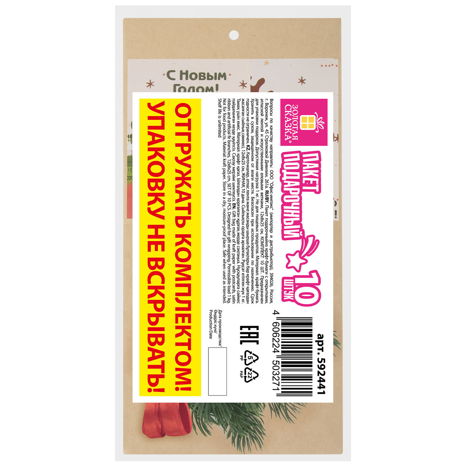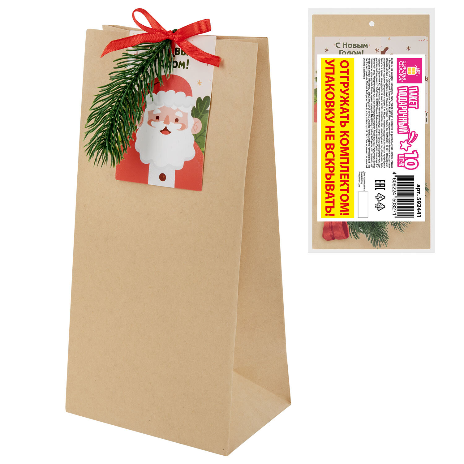 Пакет подарочный НАБОР 10 шт. новогодний, 12×8×24 см, «Magic gift», открытки, крафт, ЗОЛОТАЯ СКАЗКА, 592441