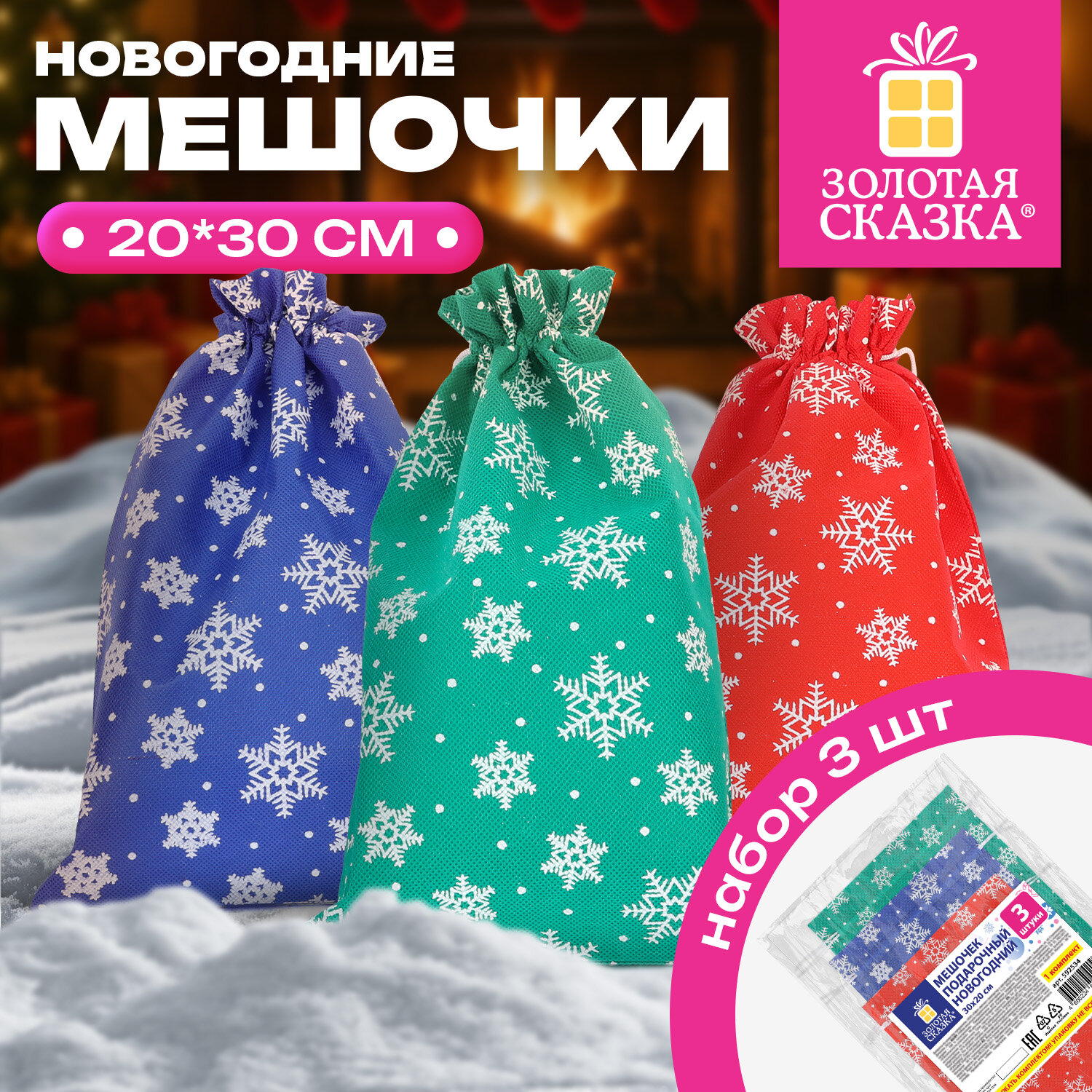 Подарочный мешок, НАБОР 3 шт., новогодний, 30×20 см, «Snowflakes», нетканый материал, ЗОЛОТАЯ СКАЗКА, 592534