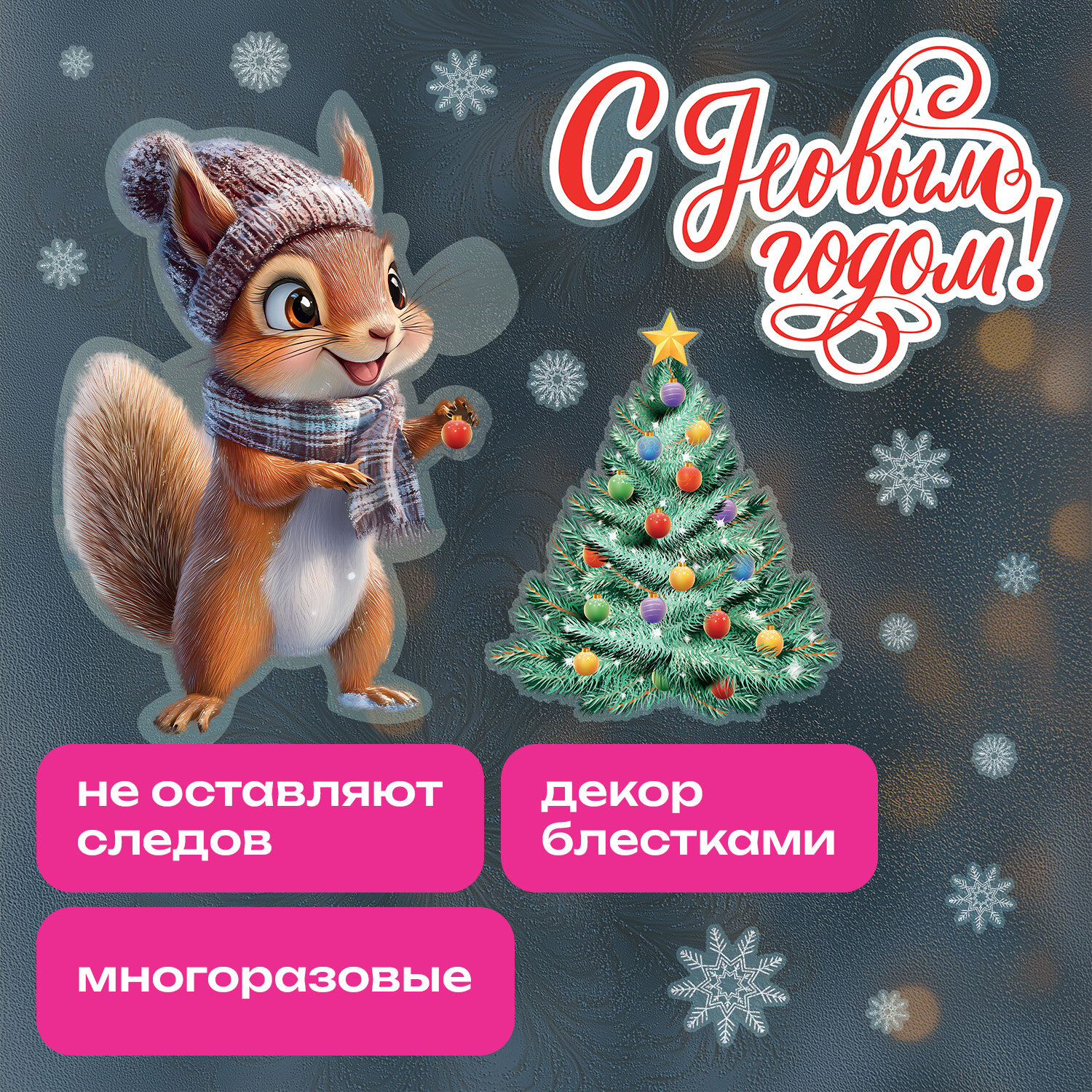 Изделие с изображением белочки и нарядной елочки представляет собой наклейку, изготовленную из поливинилхлорида (ПВХ). Наклейка размером 30x38 см декорирована серебристым глиттером.
