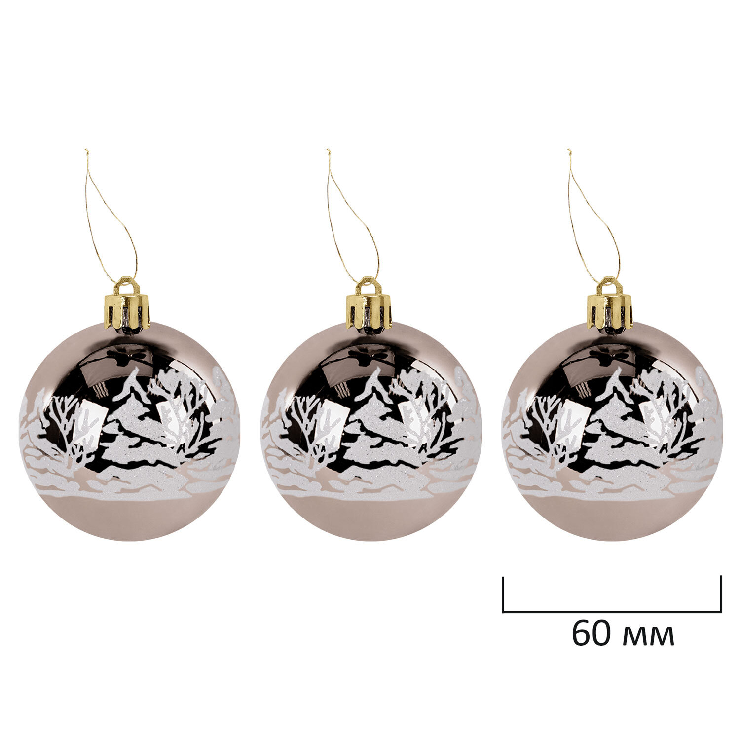 - 3 шара цвета шампань с глянцевым эффектом и рисунком (диаметром 6 см),