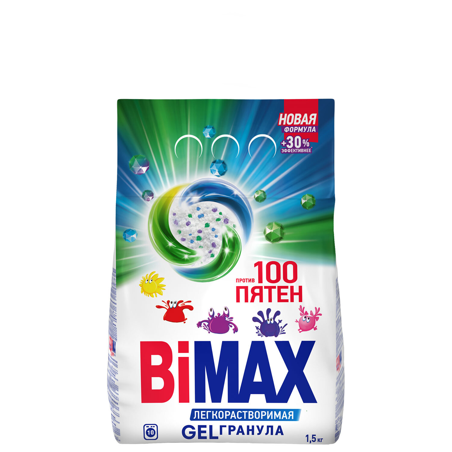 Новые компакт-гранулы BIMAX побеждают любые пятна. В 1,5 раза меньше порошка нужно для стирки большего количества вещей и удаления самых сложных пятен. Уникальный комплекс энзимов позволяет отстирать более 100 видов пятен даже при меньшем расходе порошка.