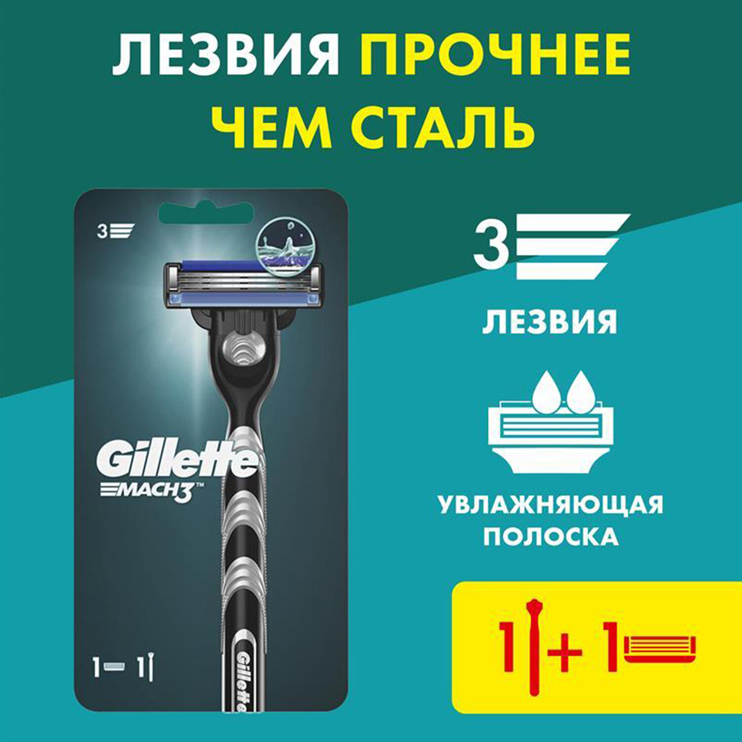 Комплектация: многоразовый бритвенный станок для мужчин GILLETTE "Mach3" – 1 шт., сменная кассета с 3 лезвиями – 1 шт. в упаковке.