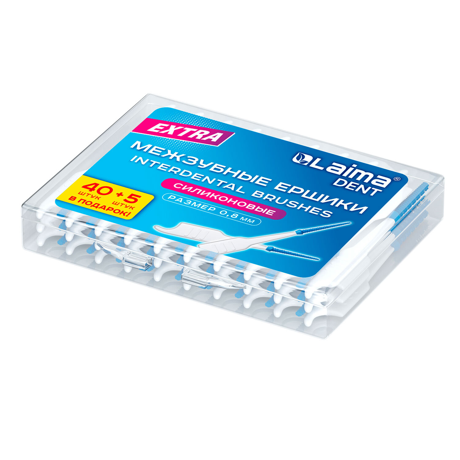 В комплекте 40 (+5) межзубных ёршиков, упакованных в удобный пластиковый бокс с крышкой.