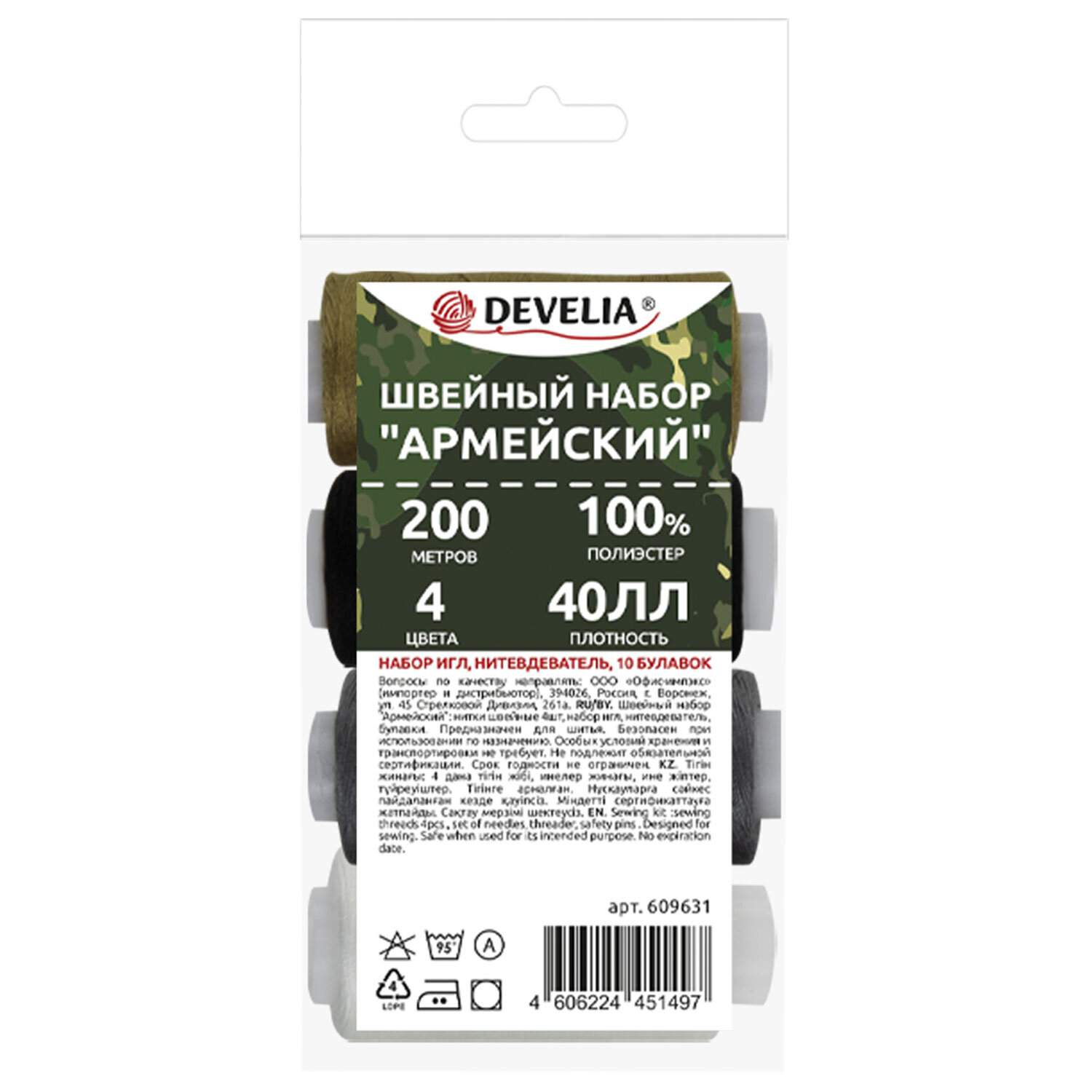 В набор "Армейский" входит 4 катушки ниток 40 ЛЛ в намотке 200 м стандартных цветов (черный, белый, серый, зеленый), иглы для ручного шитья разных размеров – 15 штук, нитковдеватель, 10 булавок. Поставляются в полипропиленовом пакете.