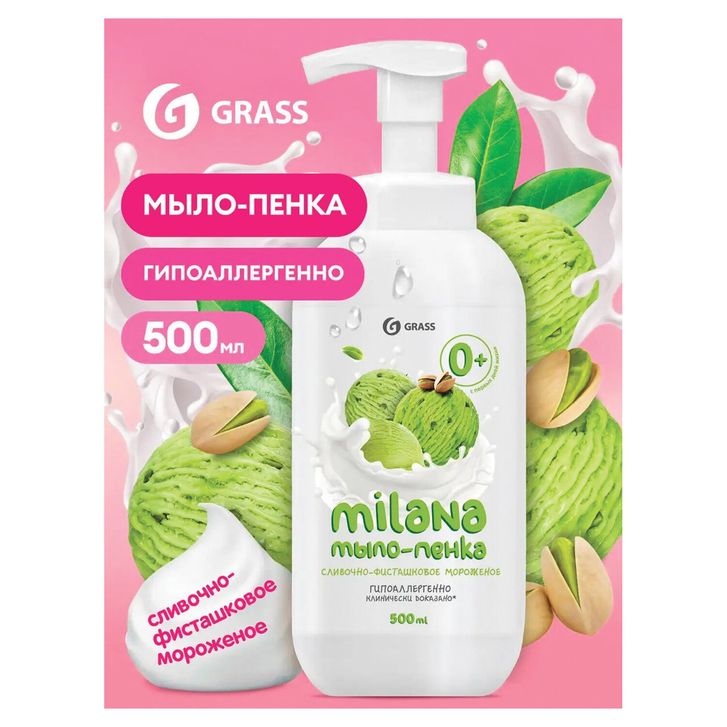 Мыло-пена жидкое 500 мл, GRASS MILANA «Фисташковое мороженое», дозатор