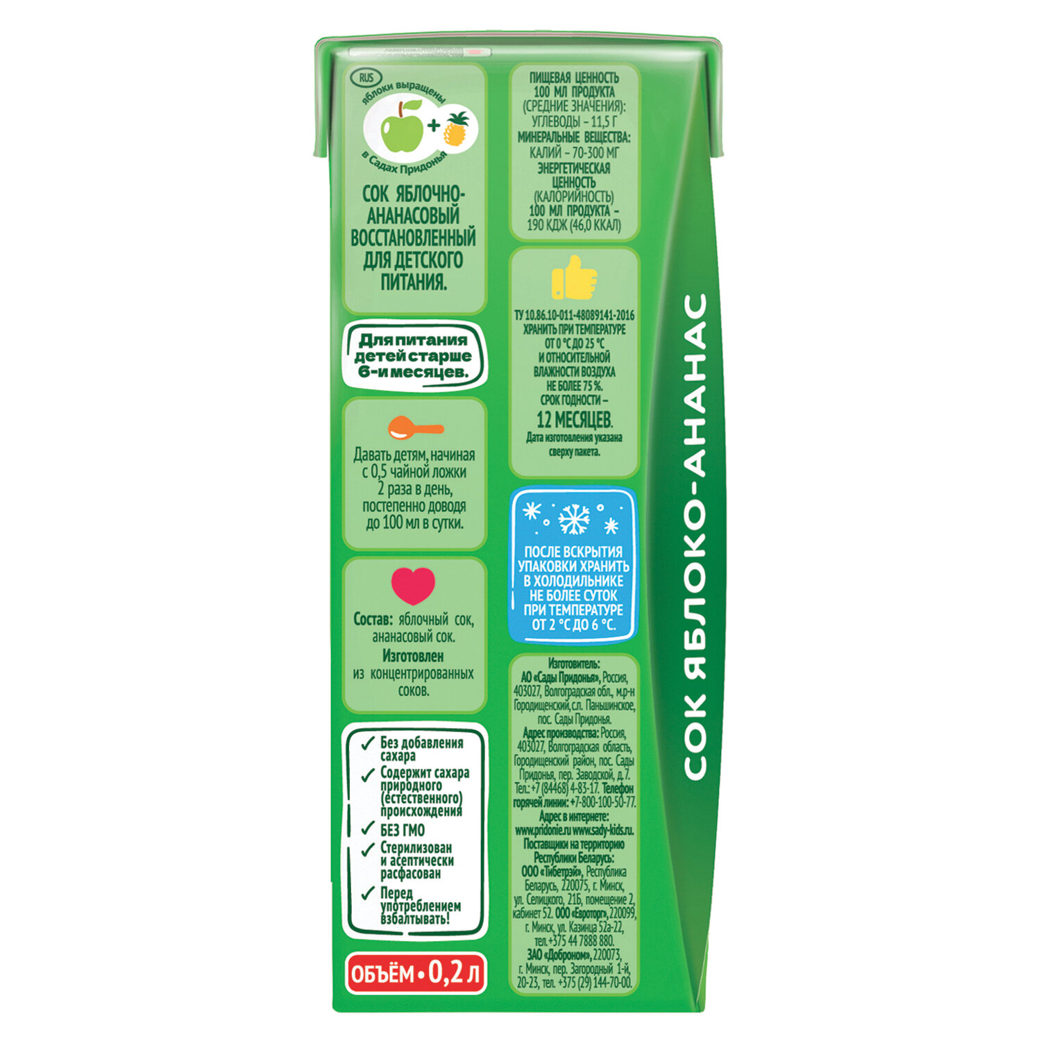 Сок САДЫ ПРИДОНЬЯ из донских яблок и ананасов – это вкусное сочетание яблочной кислинки и сладости ананаса. Натуральный, освежающий сок дарит ощущение лёгкости и бодрости, заряжает энергией. Сок обладает природной сладостью без добавления сахара.