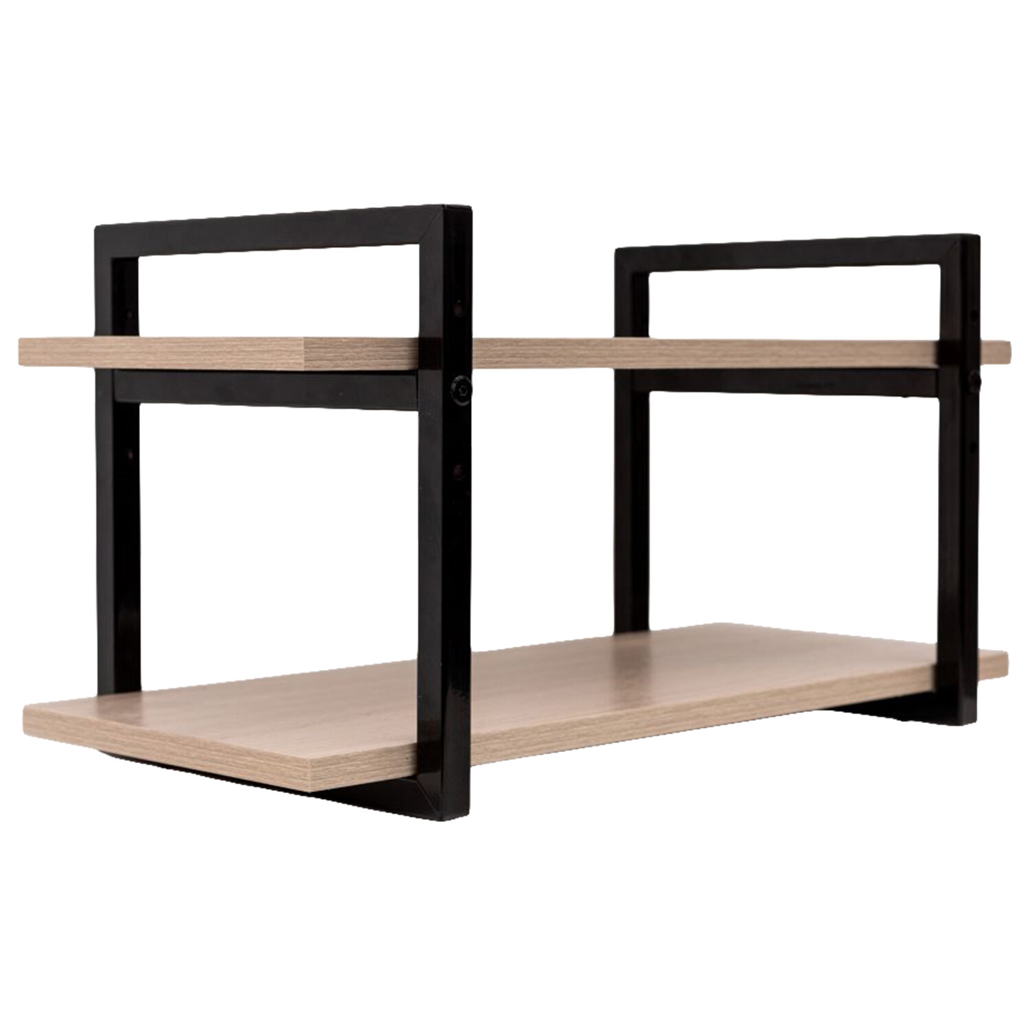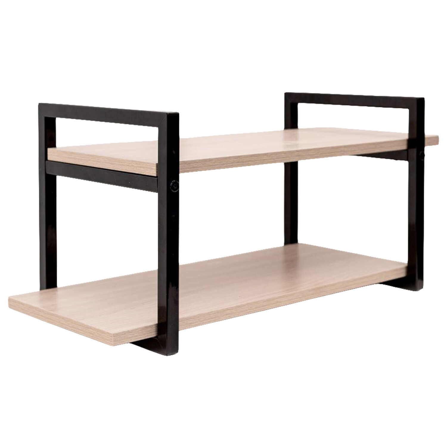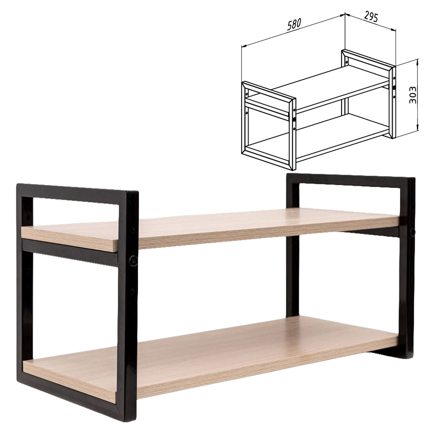 Боковины изготовлены из профильной стальной трубы 20х10 мм, покрытые порошковой полимерной краской, цвет – черный муар. Полки – ЛДСП, цвет – ясень шимо светлый.