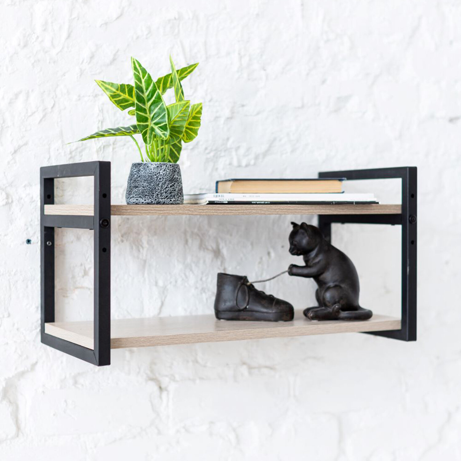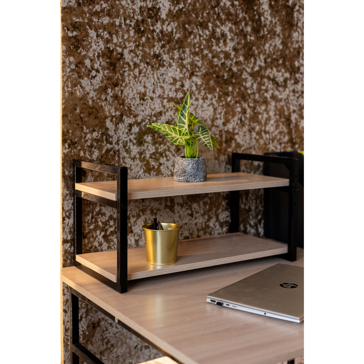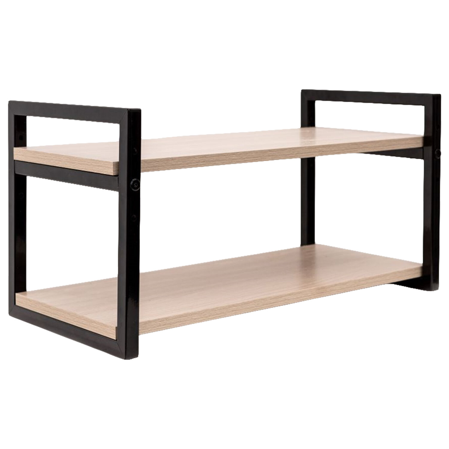 Боковины изготовлены из профильной стальной трубы 20х10 мм, покрытые порошковой полимерной краской, цвет – черный муар. Полки – ЛДСП, цвет – ясень шимо светлый.
