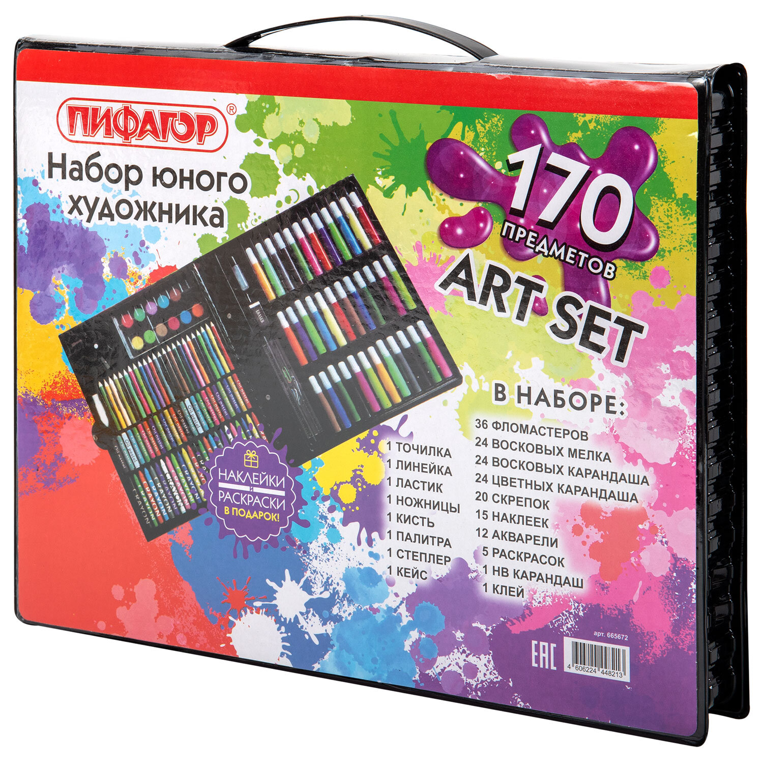Набор юного художника ПИФАГОР отлично подойдет для первых шагов в рисовании. В красочном кейсе есть все необходимые предметы для развития творческих способностей ребенка.