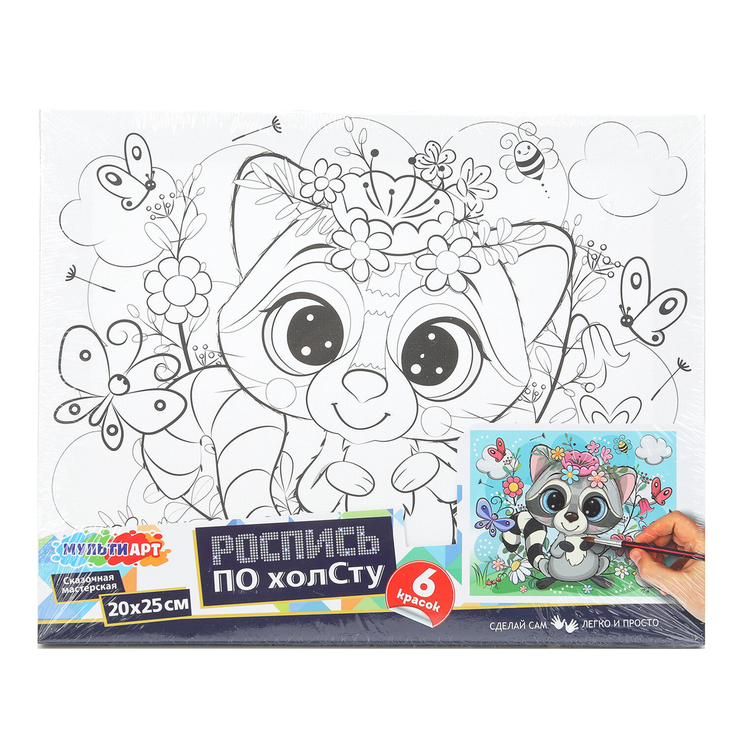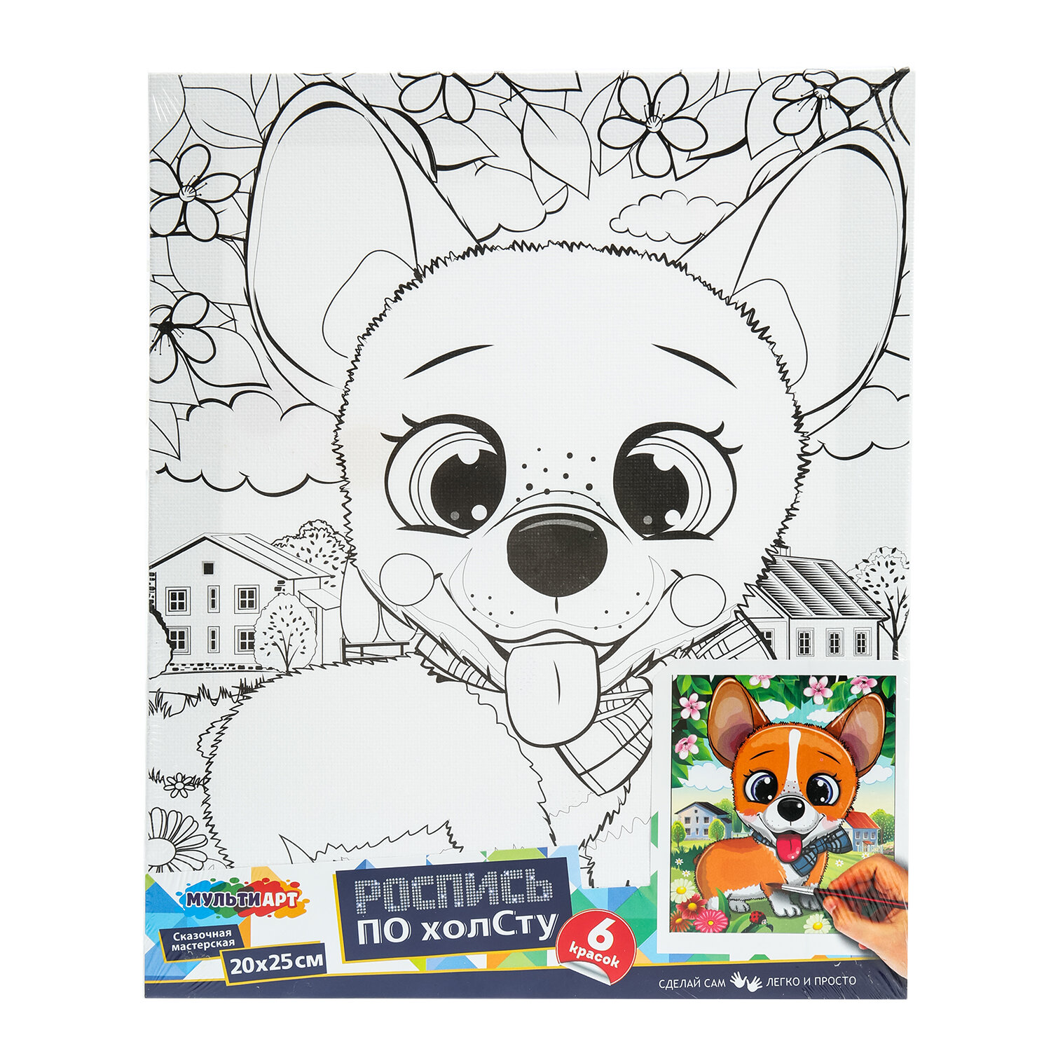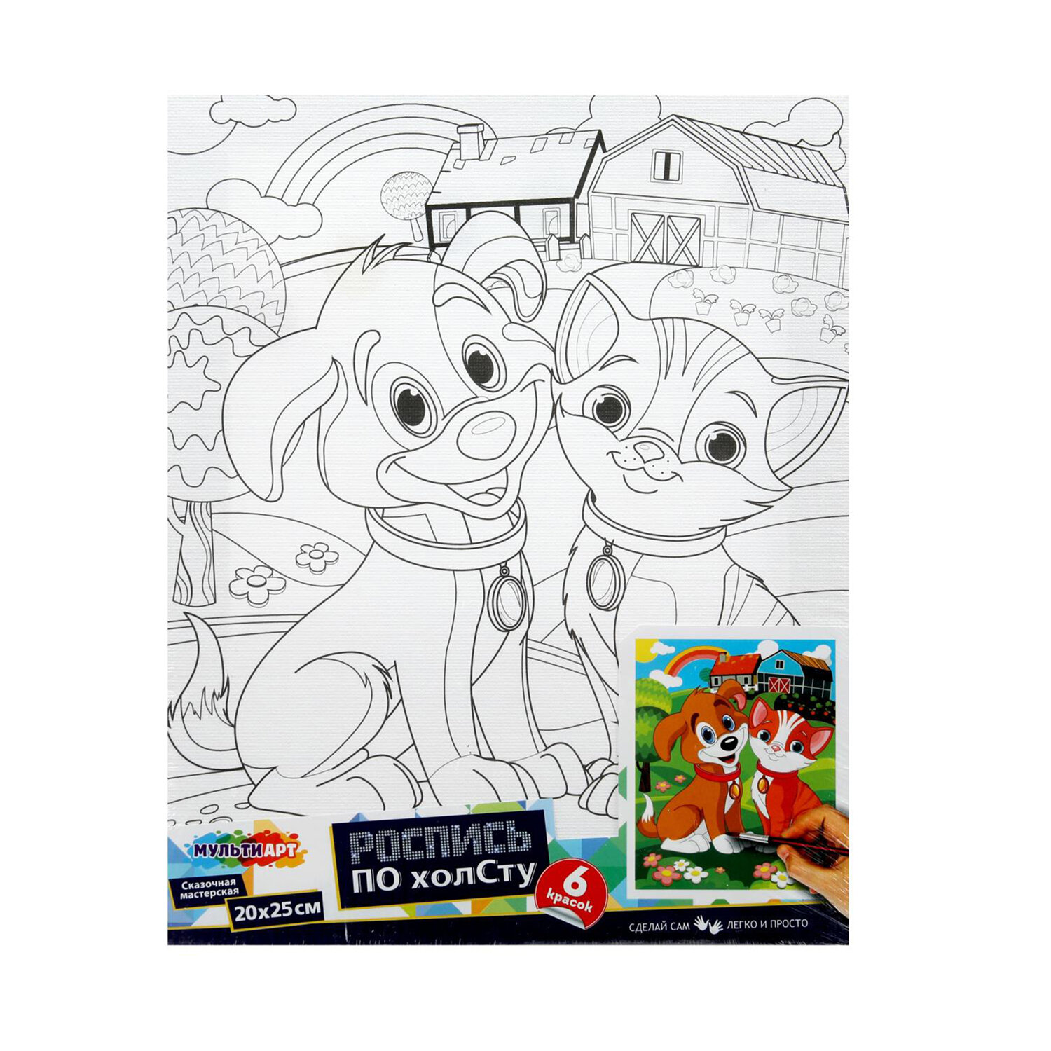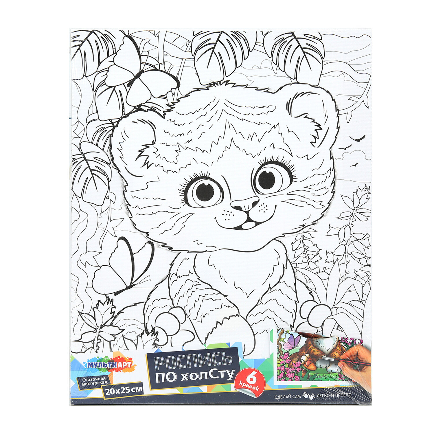 В набор входит: 1 хлопковый холст с контуром, 6 акриловых красок, 1 синтетическая кисть.