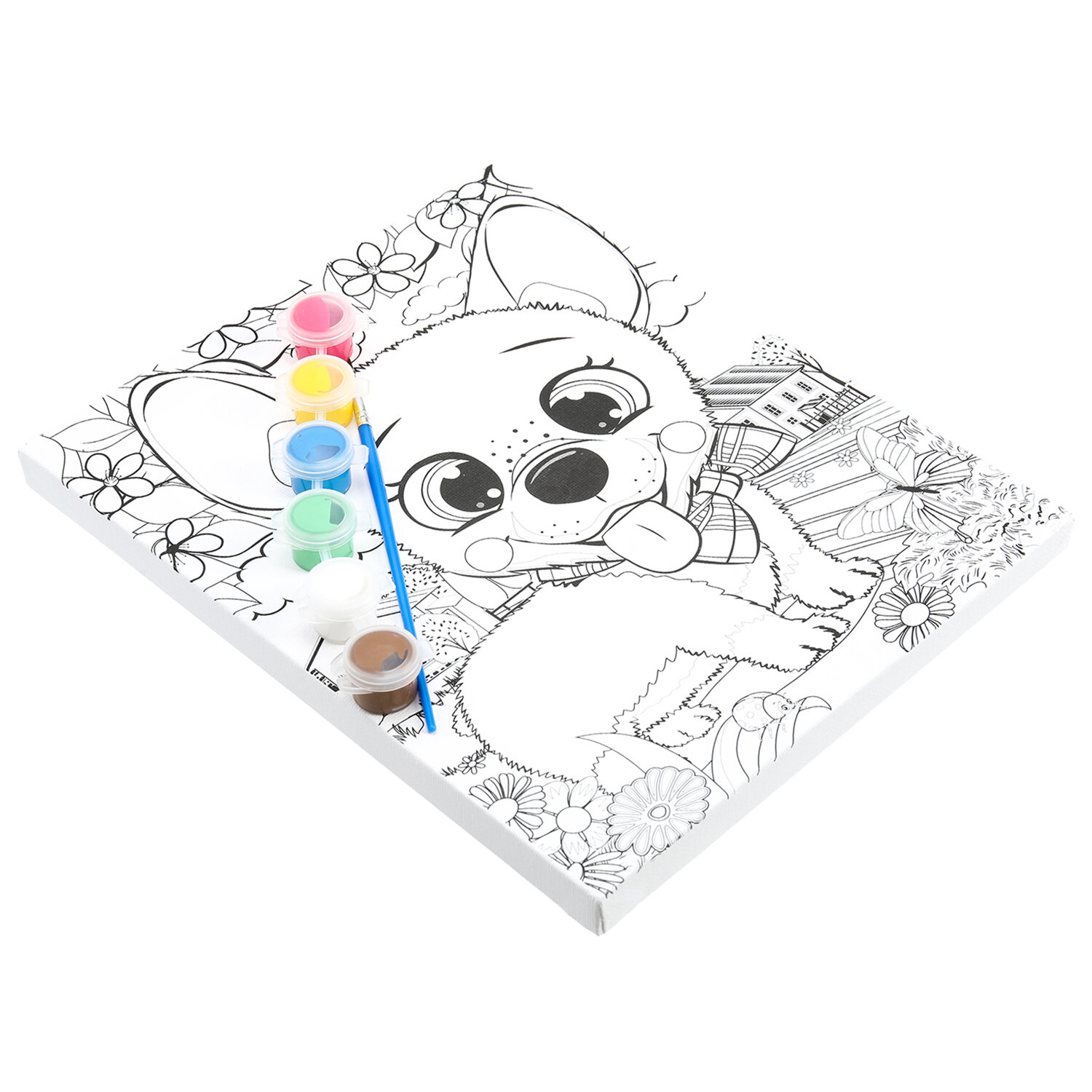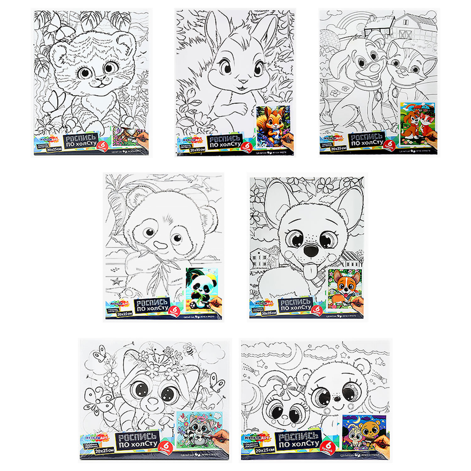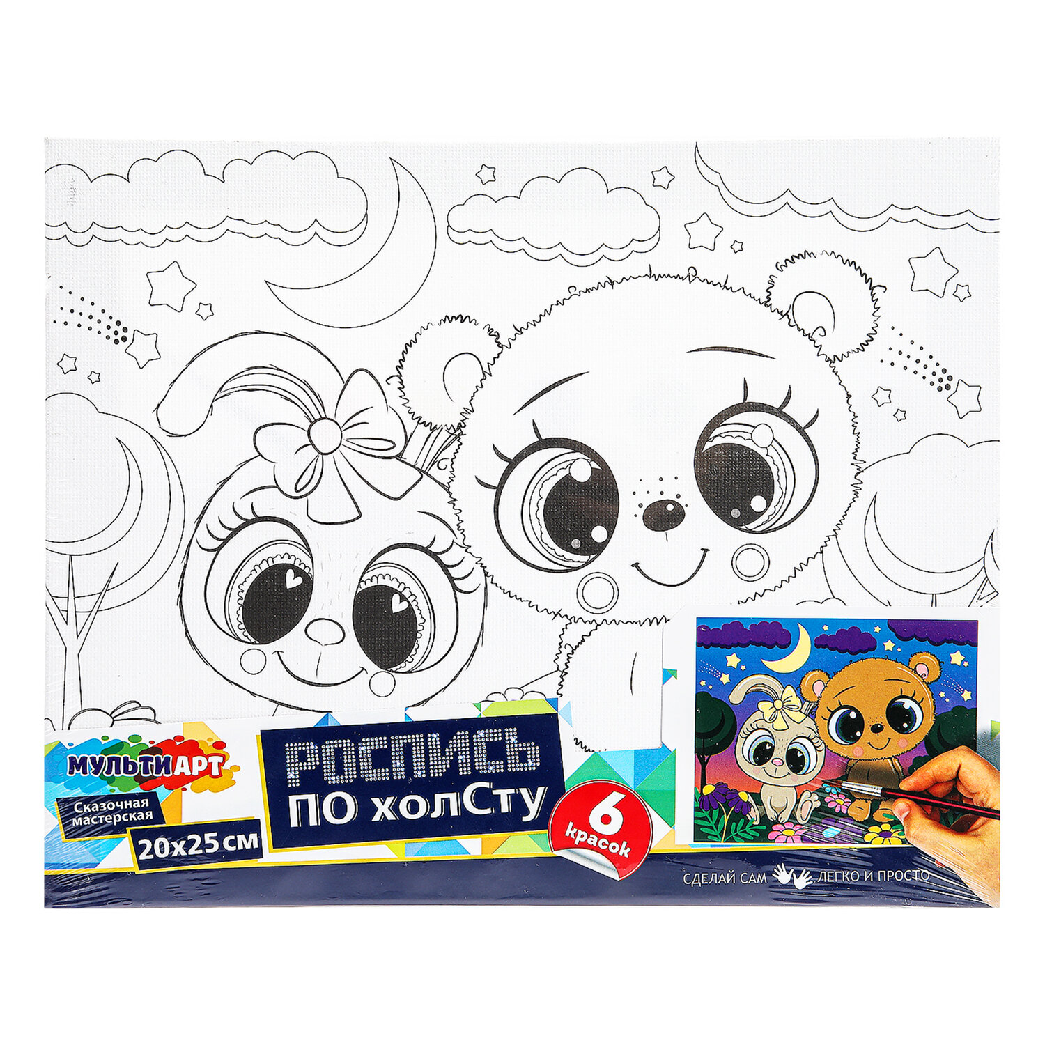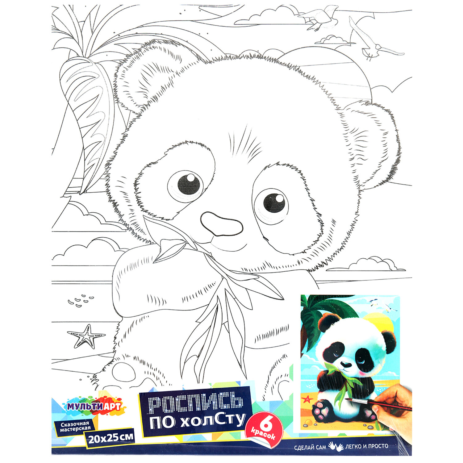 В набор входит: 1 хлопковый холст с контуром, 6 акриловых красок, 1 синтетическая кисть.