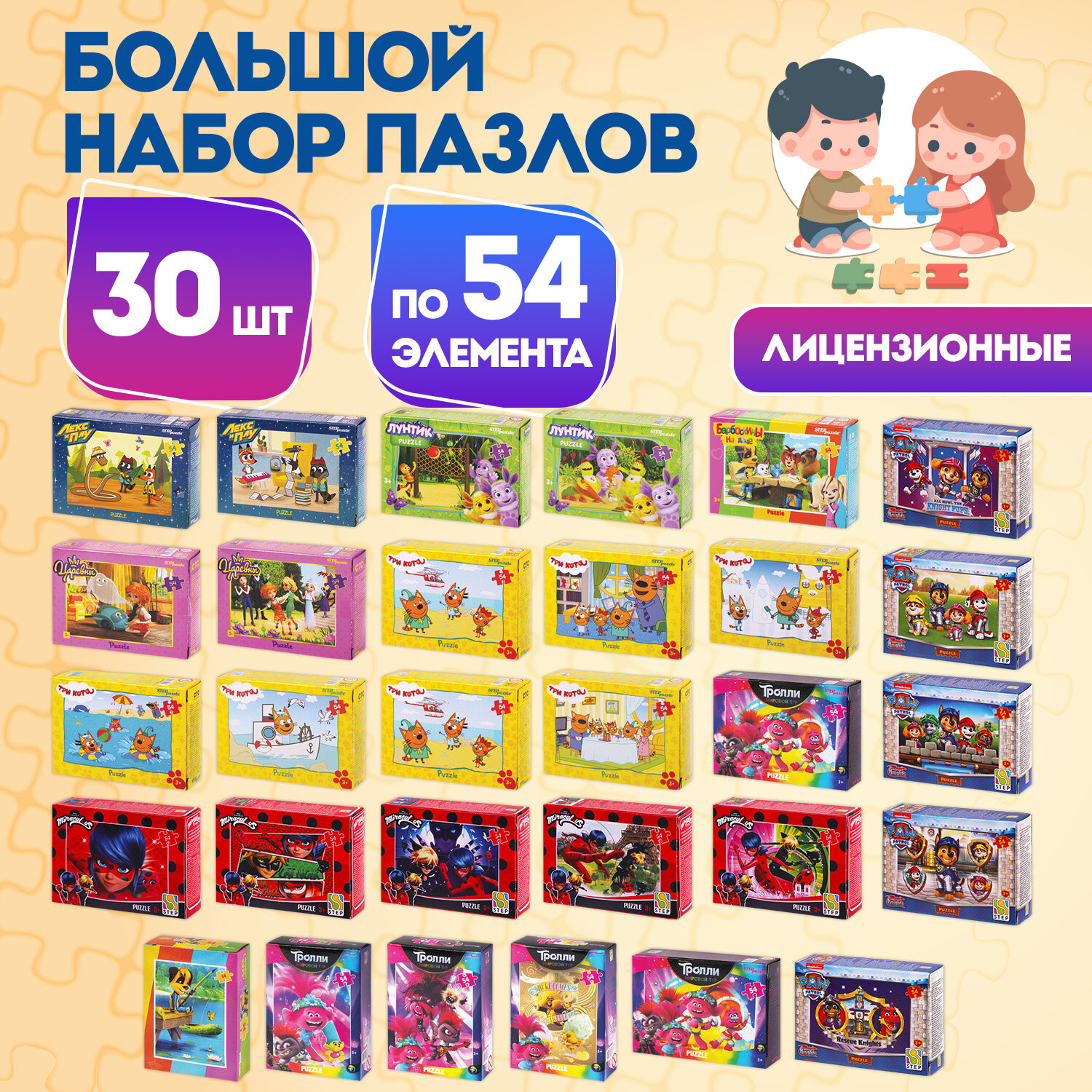 Пазлы картонные 54 элемента «Лицензионные сюжеты», КОМПЛЕКТ 30 шт., поле 17,5×13 см