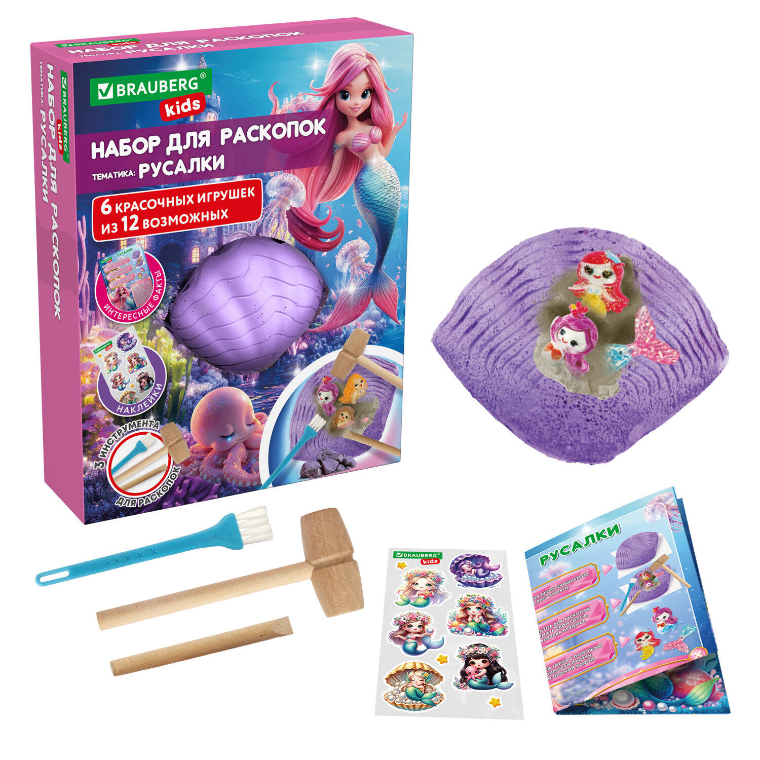 Набор для раскопок «Русалки» BRAUBERG KIDS – это магический творческий квест для юных искателей, полный волшебства и новых открытий. Приготовьтесь к увлекательному путешествию и почувствуйте себя настоящим археологом, разгадывающим тайны морских глубин!