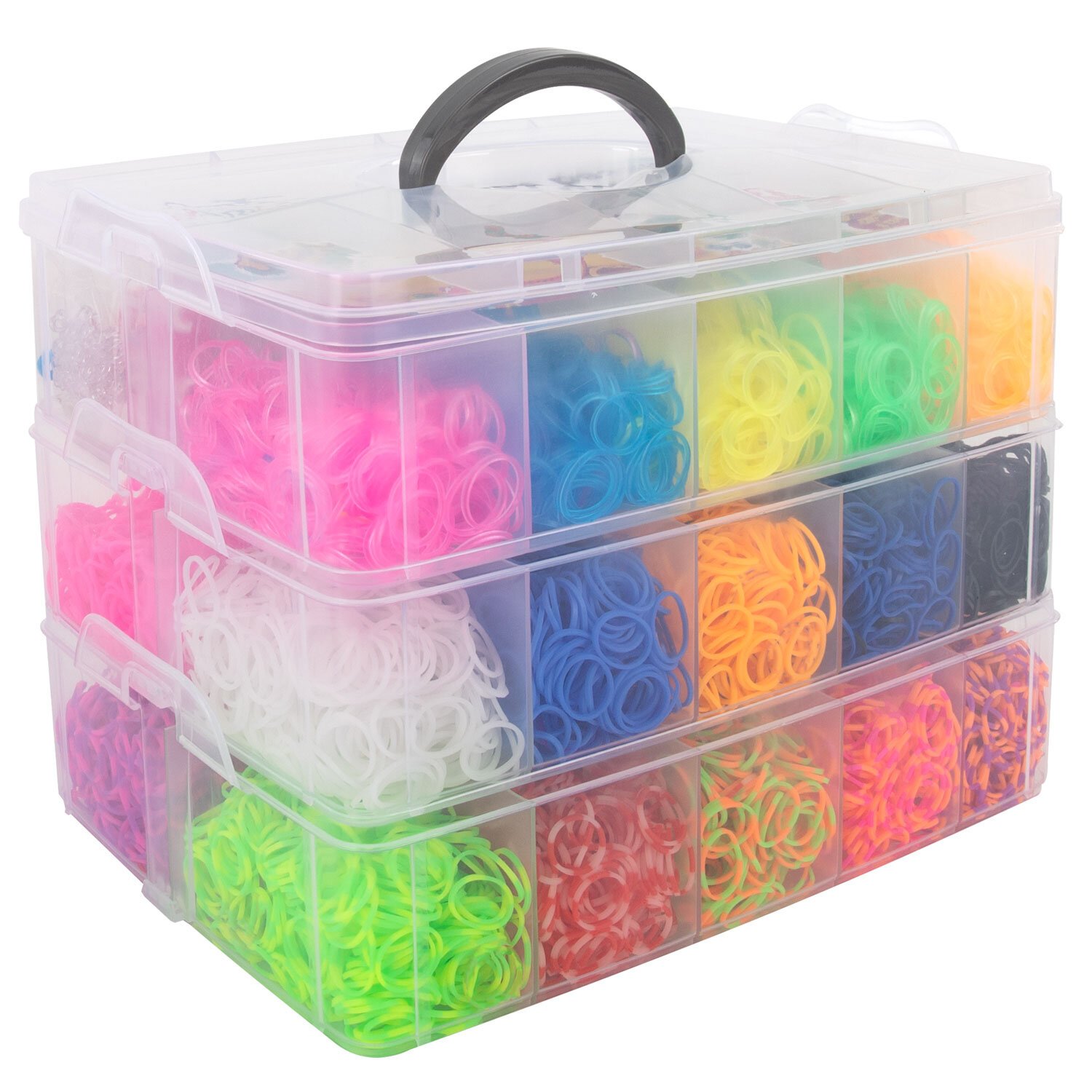 - резинки для плетения (15 000 штук, 25 цветов, 4 цвета светятся в темноте);