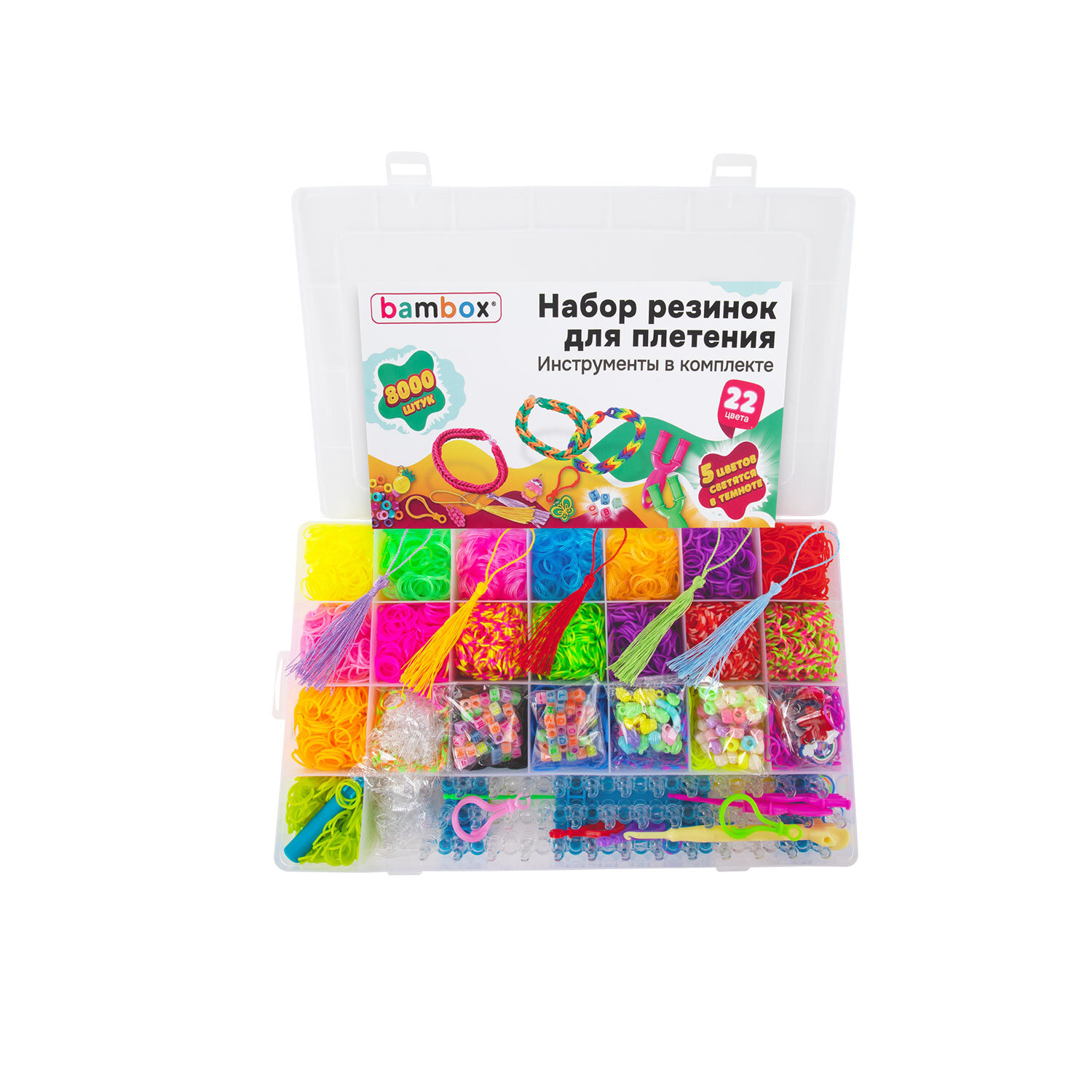 - резинки для плетения (8 000 штук, 22 цвета, 5 цветов светятся в темноте);