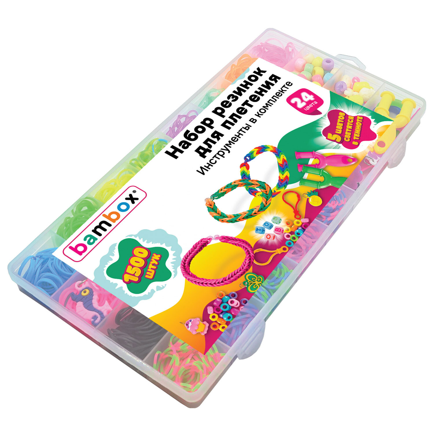 - резинки для плетения (1 500 штук, 24 цвета, 5 цветов светятся в темноте);